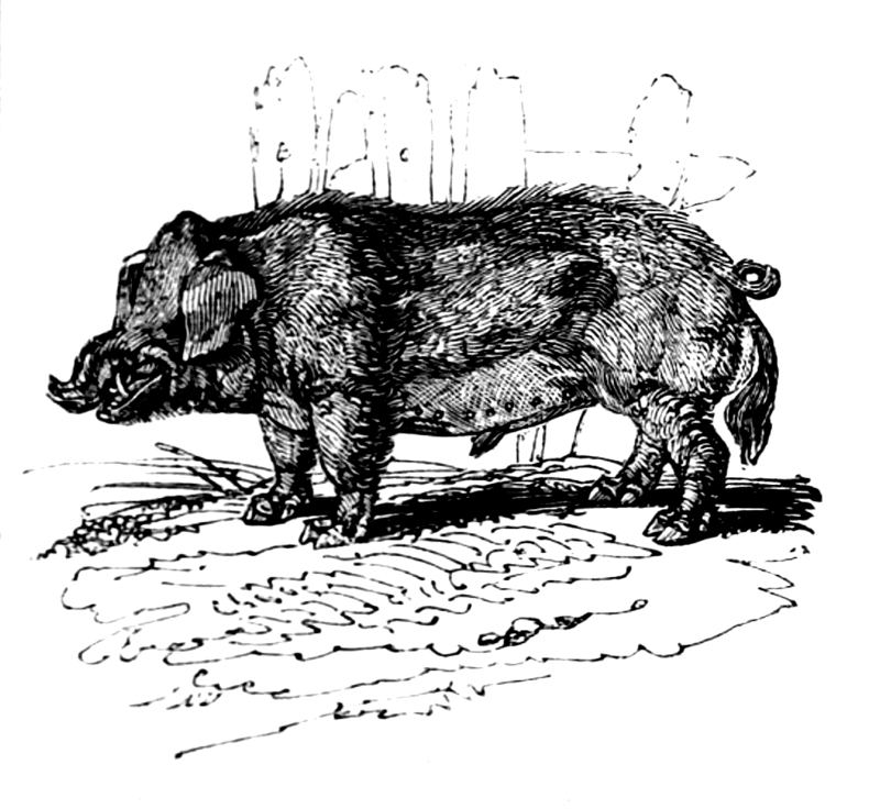 The Sow is, generally speaking, a harmless and inoffensive creature. Its food consists of a variety of things that would otherwise be wasted; the refuse of the field, the garden, the barn, or the kitchen, afford them a very good meal. These animals select with great sagacity and niceness the plants they prefer, and are never poisoned like some others by mistaking one plant for another. Selfish, obstinate, and greedy as many think them, no animal, it is said, has greater feeling for those of its own kind. They have been known to gather round a dog that teased them, and kill him on the spot. If a male and female 65are put in a sty together when young, the female will not eat her food for some time if her companion is removed from her.