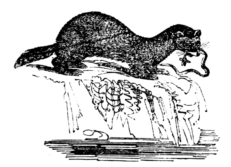 There are two kinds known in this country—the Black Rat, which was formerly universal, but is now very rarely seen, having been almost all destroyed by the large brown kind, generally distinguished by the name of the Norway Rat. This formidable invader is now found throughout the country, from whence every method has been tried in vain to expel it. It is about nine inches long; of a light brown colour, the throat and under part of a dirty white inclining to grey; its feet are naked, and of a pale flesh colour; and the tail is as long as the body. It is a very bold little animal, and when closely pursued, will turn and fasten on its assailant. 157Its bite is keen, and the wound it inflicts is painful, and difficult to heal, owing to the form of its teeth, which are long, sharp, and irregular. It is a very singular fact in the history of these animals, that the skins of such as have been devoured in their holes, (and they frequently feed upon each other,) have been found curiously turned inside out; every part being completely turned, even to the ends of the toes. How the operation is performed, it would be difficult to discover; but it appears to be effected by some peculiar mode of eating out the contents. Besides the numbers that perish in this unnatural way, they have many fierce and terrible enemies that take every opportunity to destroy them.