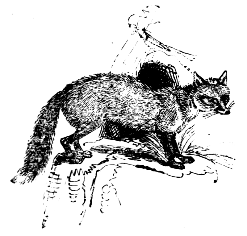 When he can conveniently do so, 97the Fox fixes his abode on the border of a wood, in the neighbourhood of some farm or village. He listens to the crowing of the cocks, or the cries of the poultry. He scents them at a distance; he chooses his time with judgment; and conceals his road, as well as his design. He slips forward with caution, sometimes even trailing his body; and seldom misses his booty. If he can leap the wall, or creep in beneath the gate, he ravages the court-yard, puts all to death, and retires with his prey. He hunts the young hares in the plains; and seizes the old ones in their seats. The eye of the Fox is of a lively hazel colour, and very expressive.