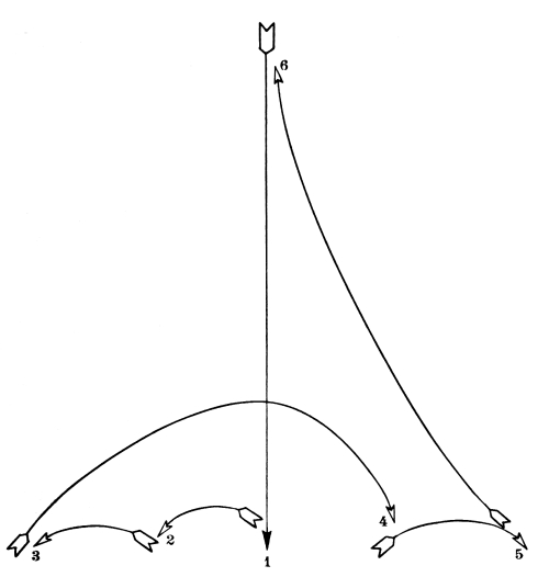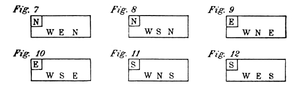 For each style, there are four different positions which, for practical reasons, have been named after the points of the compass; North, South, [Pg 9] East, and West. The drawings contained in this chapter are of the four different positions, for each style of exercise. In the diagram of exercises each of these points is indicated by a letter; N—for North, S—for South, E—for East, and W—for West.
