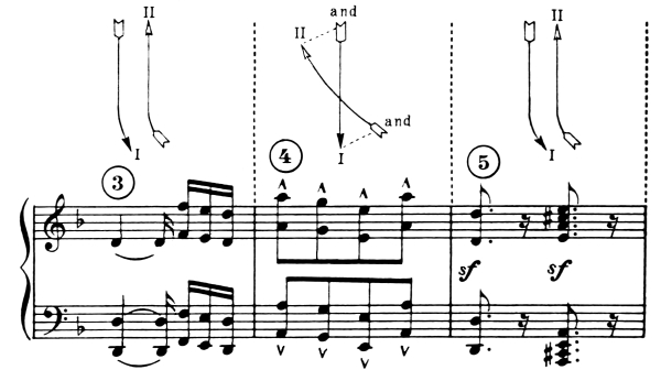 Each figure is to be executed in time with certain music examples of which each individual note corresponds to a point of arrival.