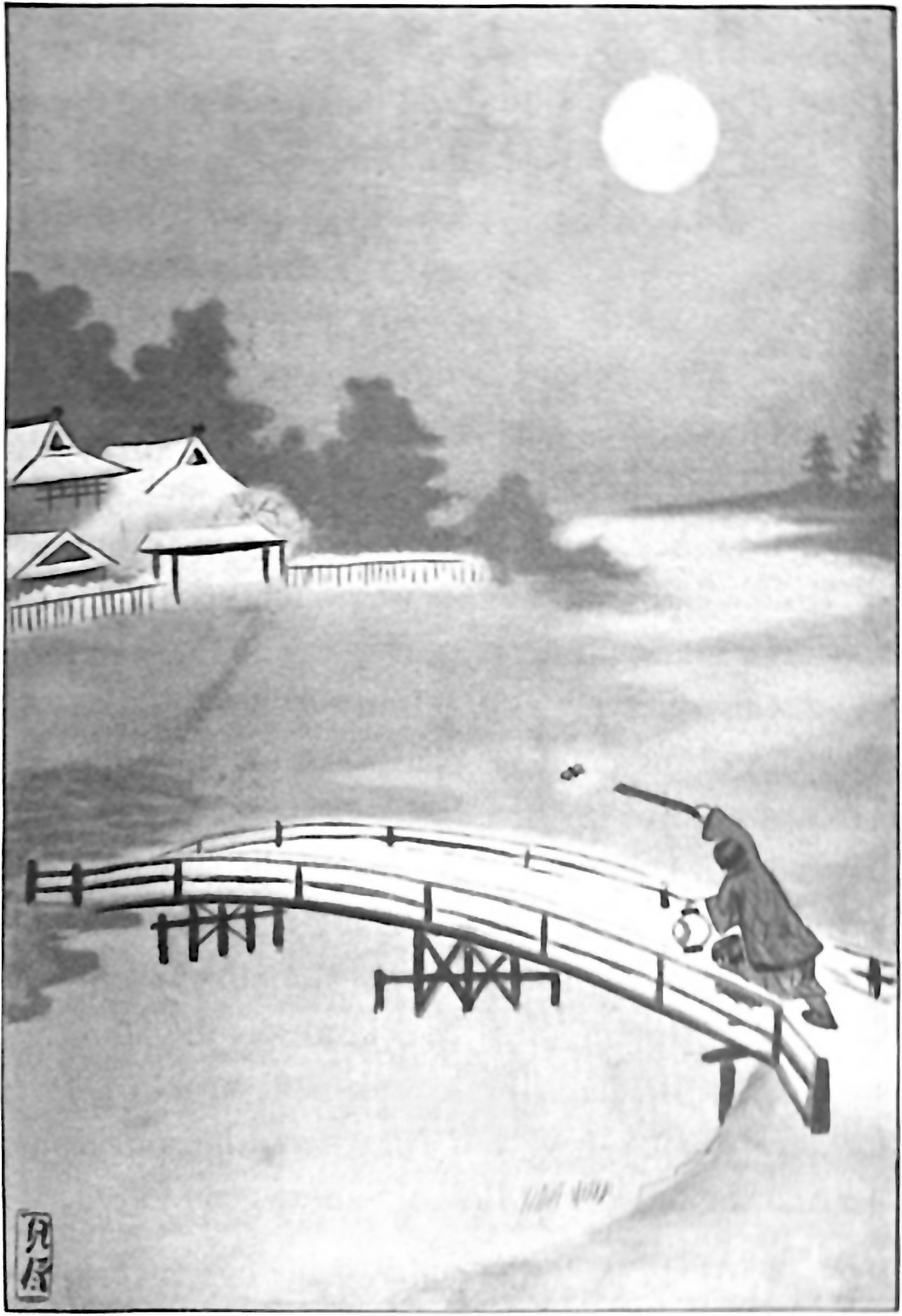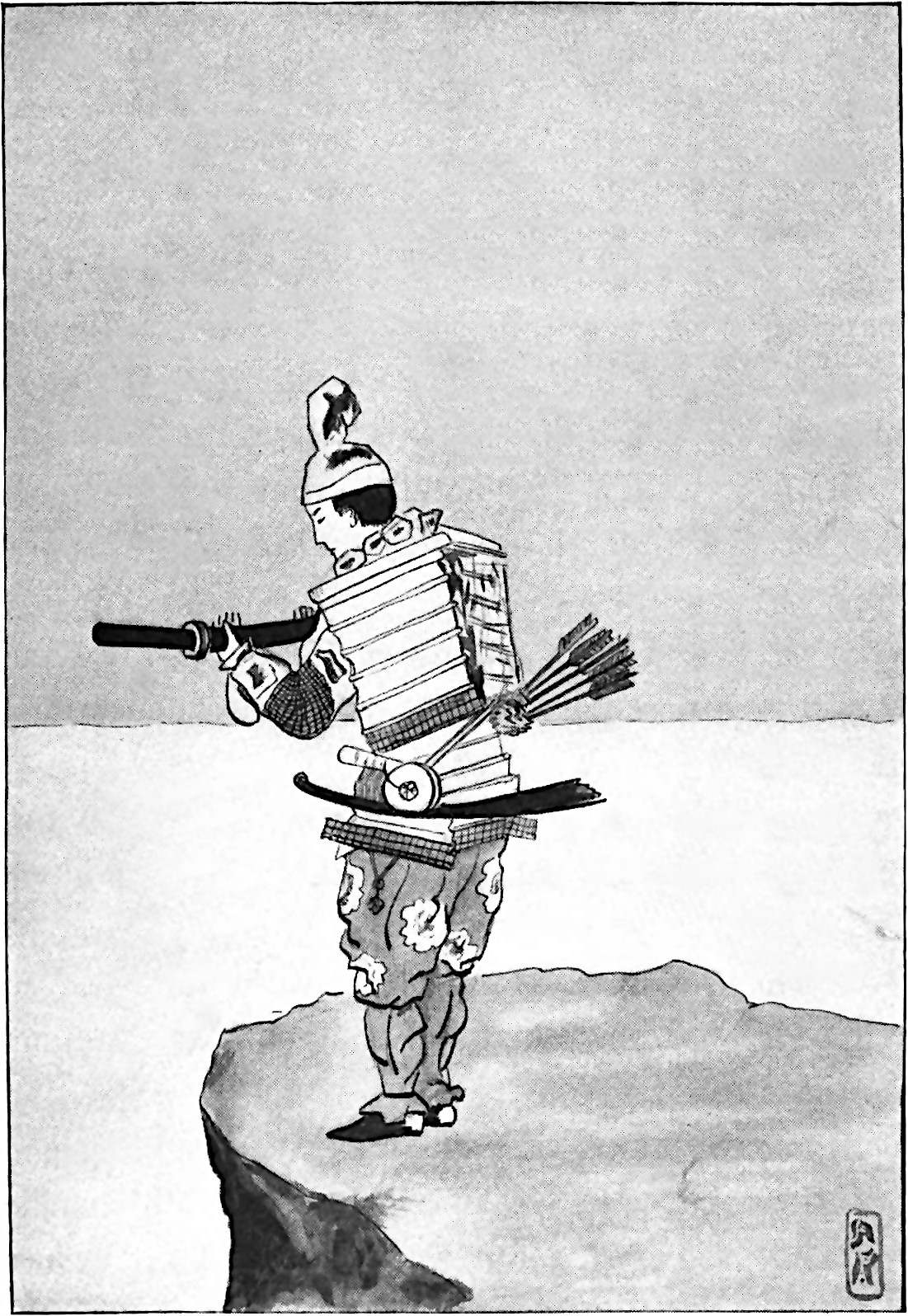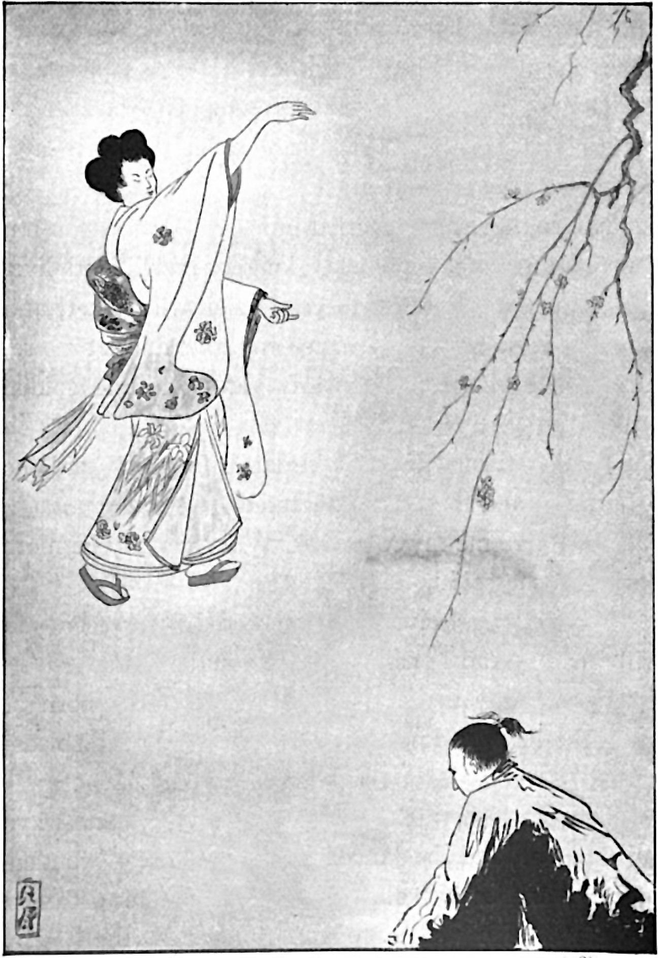 Ruined though the temple was, it still held a shrine and hither came Wakiki Mononofu, a young Samurai.[3] He was a brave young soldier who was seeking his fortune in the wide, wide world. He had lost his way and wandered in the forest seeking the path, until at length he came to the little clear space where was the temple. A storm was coming up, and a palace could not have seemed more welcome to the young warrior.