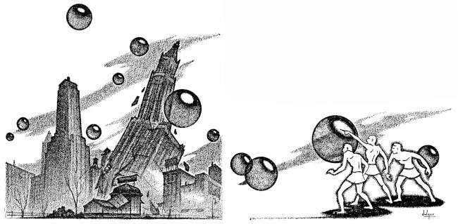A breathless instant. Slowly at first, like a felled forest giant, the great structure was coming down. Slowly, then with a rush it fell to the south—fell in great shattering segments. Crashed with a soundless crash upon the several blocks of nearby buildings. Crashed and tore with the thousands of tons of its weight, smothering everything beneath its crashing masonry and steel.... A soundless chaotic scene of ruin and death over all those city blocks, with huge rising clouds of dirt and smoke mercifully to obscure it.