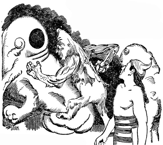 In a moment we had been halted before the dais, and then one of our guards glided forward, the mass of flesh that was his body twisting and changing with lightning-like swiftness in the strange communication of these creatures. I had no doubt that he was explaining our capture, and when he glided back the great creature on the dais contemplated us for a time in motionless silence. Then his own body writhed suddenly in protean change, in silent speech, and instantly one of the nine creatures behind him glided from the dais and through a small door in the wall behind it, reappearing in a moment with a complicated little apparatus in his grasp.