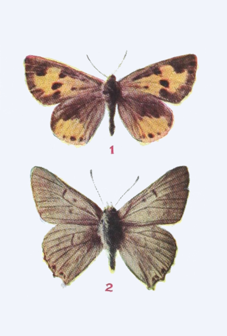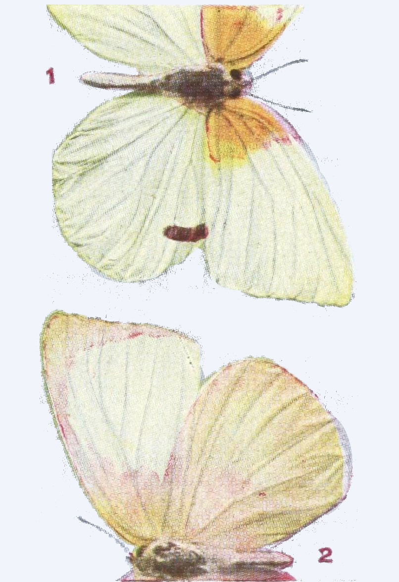 The internal organs of reproduction in the female consist of the ovaries, from which the eggs pass by way of the oviduct to the ovipositor, which in butterflies is not so conspicuous or remarkable an organ as is the case in many other insects. Communicating with the oviduct are the spermatothecæ, which are receptacles in which is retained the fertilizing fluid received from the male at the time of coition. As the eggs, one by one, are passed from the ovaries into the oviduct, they are impregnated through absorption of the spermatozoa, which enter their walls, imparting to them vitality. The internal organs of the male are tubular vesicles, or testes, which secrete the seminal fluid, which by means of the intromittent organ is introduced into the spermatothecæ of the female. Union between the sexes among insects generally takes place but once, and is not recurrent. The female, having been impregnated, proceeds at once to lay her eggs upon the tender leaves or the bark of the plants upon which her progeny are to be nourished, and then promptly dies. The life of insects in the winged form is usually very brief. Inasmuch as there are great differences between the sexes in insects alike in size, form, color, and markings, it is well for the collector to carefully preserve specimens which may be captured in copulation. Such specimens should be designated as “Taken in coitu.” The writer in such cases uses the formula “A ♂ in coitu with B ♀,” which is put in minute handwriting upon a label and placed upon the pin bearing the male insect. Upon the pin carrying the female insect there is put the label “B ♀ in coitu with A ♂.” The finding of insects in copula is sometimes the only way in which to definitely settle the question of sexual relationship between forms. So different are some insects that the two sexes have in a number of cases been described by early writers as belonging not merely to different species, but to different genera, and even families.