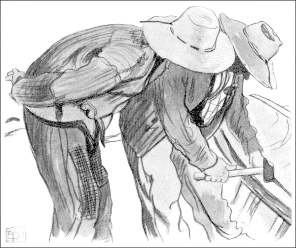 Il déboucha sur le port. Tantin Rétu, sa vieille cloche de paille en travers de la nuque, un arrosoir dans chaque main, remontait du fleuve en traînant ses énormes sabots. Sa pipette vissée aux dents, il allait soufflant, renâclant, dans le ballottement spacieux de ses fonds de culottes, comme si depuis deux jours il n’avait pas une seconde interrompu son fatigant labeur. A chaque pas l’arrosoir se déversait en petites flaques qui claquaient près de ses sabots.