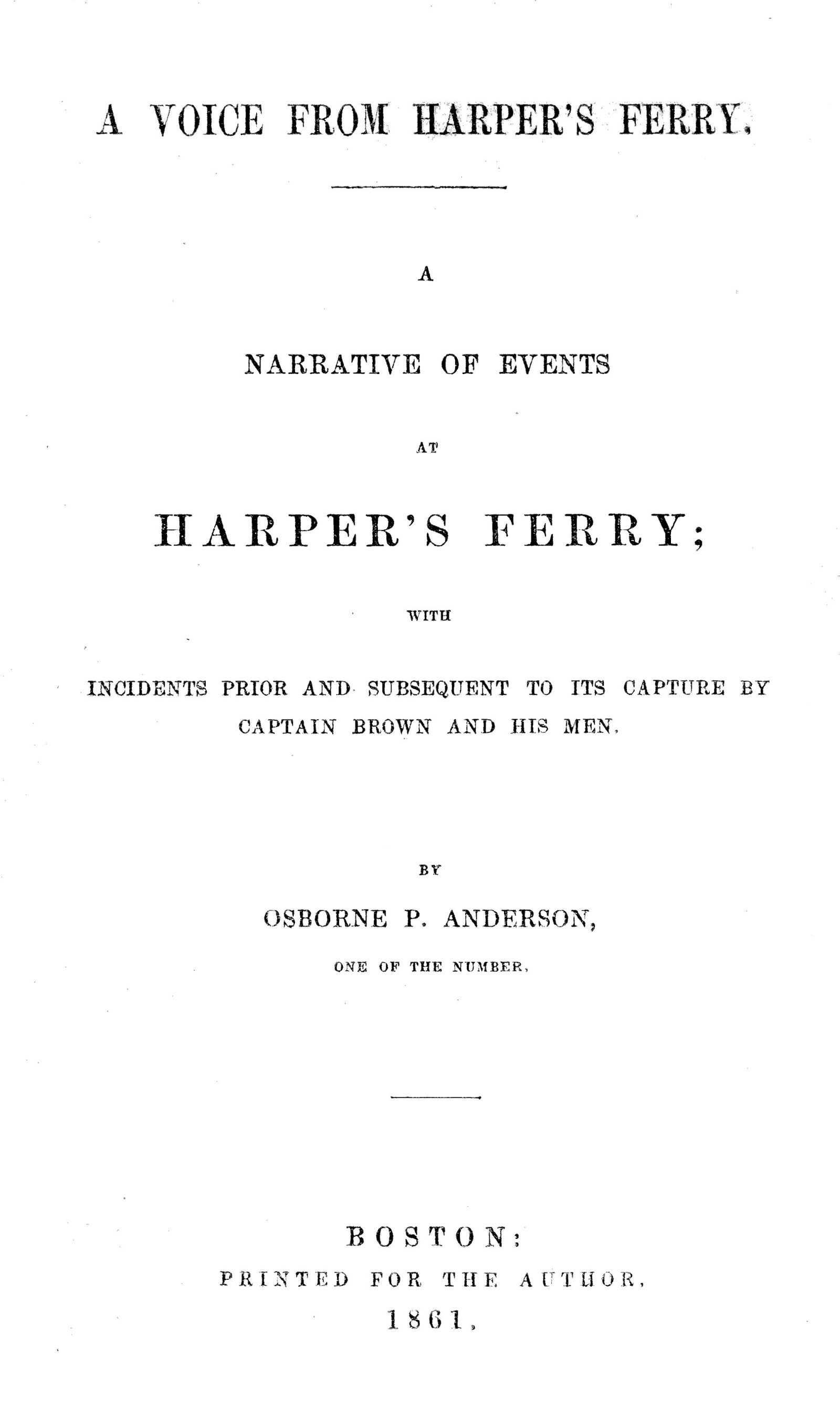 My sole purpose in publishing the following Narrative is to save from oblivion the facts connected with one of the most important movements of this age, with reference to the overthrow of American slavery. My own personal experience in it, under the orders of Capt. Brown, on the 16th and 17th of October, 1859, as the only man alive who was at Harper’s Ferry during the entire time—the unsuccessful groping after these facts, by individuals, impossible to be obtained, except from an actor in the scene—and the conviction that the cause of impartial liberty requires this duty at my hands—alone have been the motives for writing and circulating the little book herewith presented.