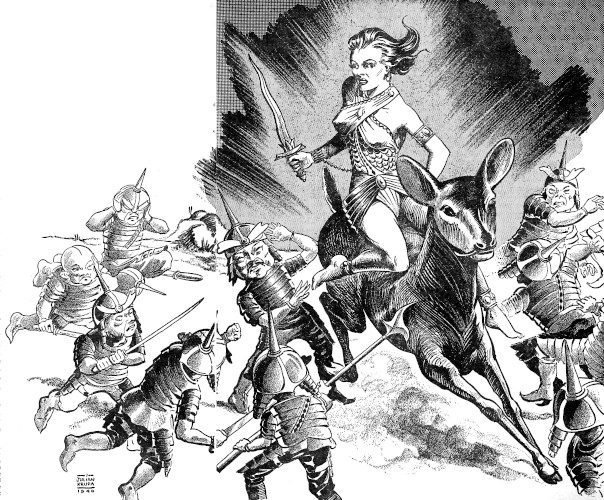 Still another place a handful of Mayco invaders fought vainly to fight a diverse foe—the Women before them and the Wild Ones who charged upon their flank. Up to now the Japcans had been content to subdue this Jinnia uprising with the green, stupefying ray; now they broke out their red weapon. Meg curdled with agony to see Women die beneath that cherry-flame.