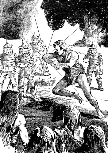 There was little—pitifully little—to watch. By the time she reached her vantage point, the horde of Wild Ones had deployed in a great circle about the Jinnia village; now, at a signal from Daiv, they rose like a great, swarthy tide and rushed down upon their enemy.