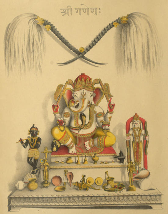 His quadruple hands and arms denote power. In one of his hands is the ānkus, the instrument with which the elephant is guided; in another a battle-axe. Being a child, and therefore fond of sweetmeats, a third hand bears a small cup filled with pera, a sweetmeat common in all bazārs; in the fourth he carries a short rosary, wherewith he counts his beads. Around his neck is twined the Cobra-di-capello, the holy serpent, whose hood is outspread upon his breast. This image is dignified by a frontal eye, signifying the sun, encircled by a crescent, a sol lunar emblem and mystical mark, hence “moon-crowned,” “triple-eyed.” His attendant, a rat, holding a pera, sweetmeat, is placed at his side: on his head is a crown, and around his limbs a yellow dhotī, a cloth of Benares tissue edged with gold. His body is covered with ornaments of rich jewellery, such as are[x] worn by men in the East,—his single tusk is bound with gold,—his hands and feet are dyed with menhdī, hinnā. On each of his four arms are two bāzūbands, or armlets; and chūrīs, or bracelets, of massive gold, adorn his wrists. A golden plate on the back of the hand is fastened round the wrist by chains of gold, and from the upper part similar but finer chains pass over the back of the hand, and unite with rings on all the fingers and the thumb. This ornament is very peculiar; both hands are thus adorned. The chaunrīs above his head, emblems of royalty, are used by the attendant Brahmāns to keep off the flies; they wave them over the head of the idol during pūja.