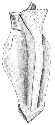 This femur is of large size, moderate length, and has a shaft subcylindrical in section. The distal end is expanded and the condyles are flattened, the inner one being the wider, the outer condyle being narrower and the external margin projecting to make a high ridge. The pit on the posterior side of the shaft just above the condyles is unusually deep and of large size. On the anterior side there extends from either condyle a low marginal ridge which soon fades into the contour of the shaft. Between these ridges there is a wide shallow furrow which also loses itself above in the convex surface of the shaft. [Pg 227]