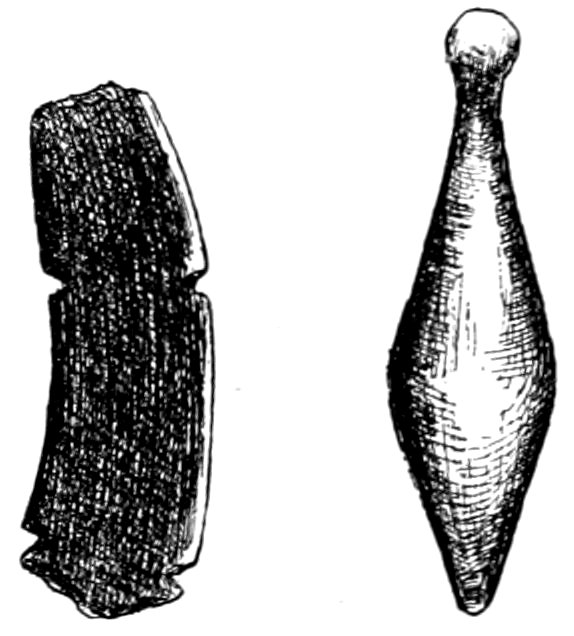 455Various uses have been assigned these and I have commented in so many of my writings on tubes, that one would tell an old story to repeat all that has been said. It suffices to say, that passing from the bead class to larger objects, the size of marbles, these may have been worn as stone beads. But these stone objects are usually made of banded slate. They may be oval in outline, such as Fig. 395, or long and slender, as Fig. 396. Again, some are grooved, others flattened, others rounded, and yet some are square.