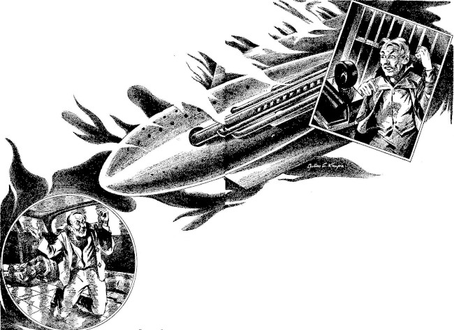 "Donovan—" He turned to me—"you will remove the fruits of Mr. Biggs' labors from the Saturn's hull. The heat which now inconveniences us will vanish when we are no longer the core of an electro-magnet. But just to make sure that no further efforts are made to beguile us into terror created by non-existent dangers, henceforth I will assume responsibility for all electrical stores and equipment aboard. That is all! Get to work!"