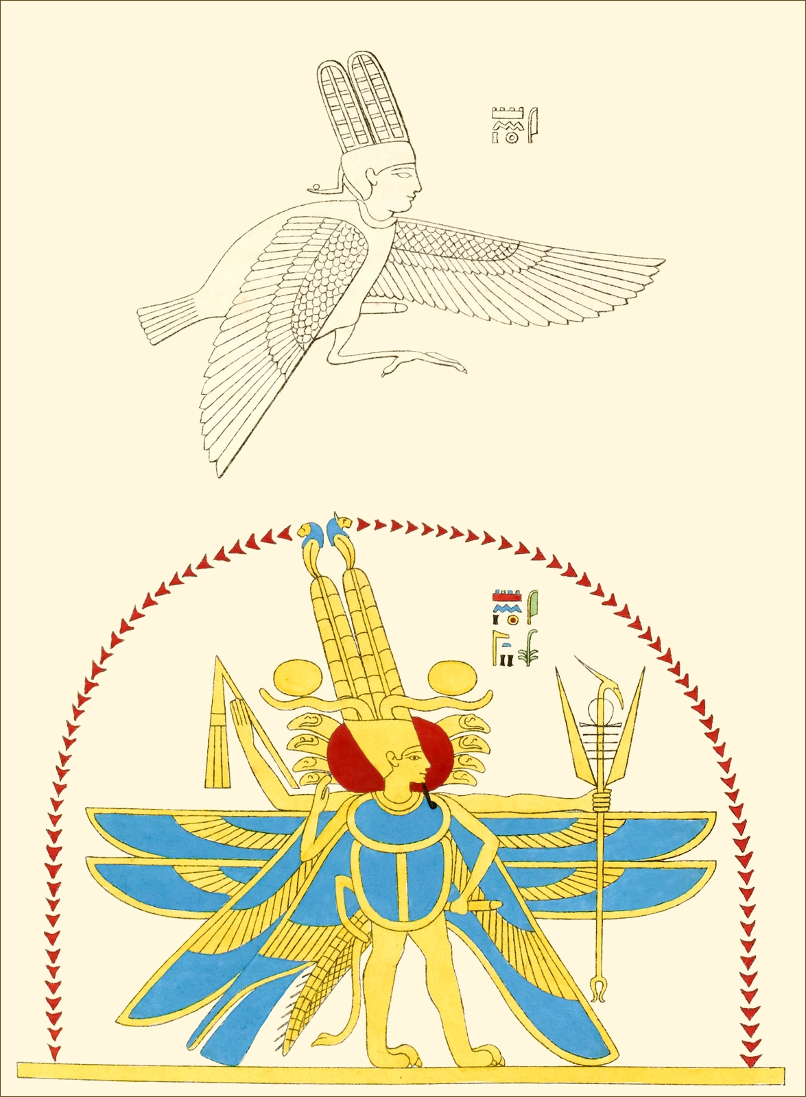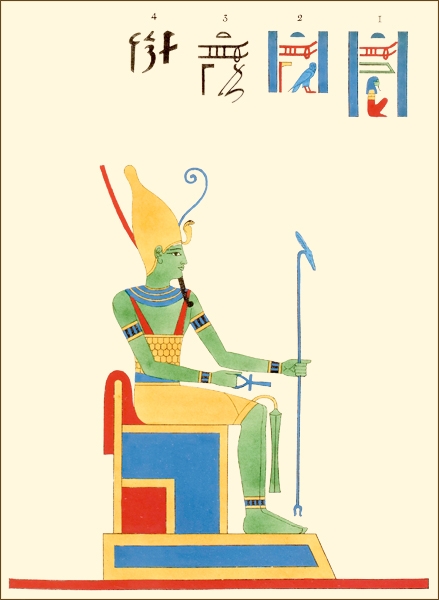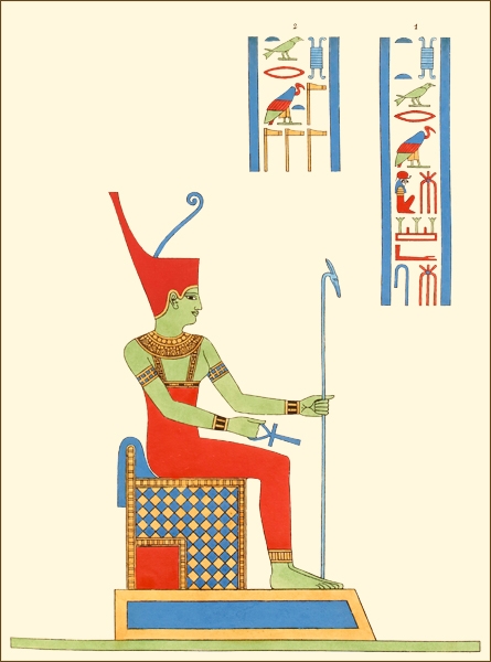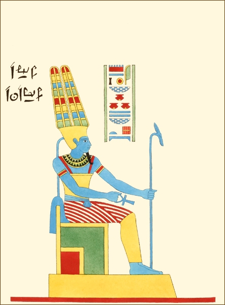Ce dieu, de forme humaine, est ici représenté assis sur un trône, comme le sont pour l’ordinaire toutes les grandes divinités de l’Égypte. Sa carnation est bleue, couleur propre à ce personnage; sa barbe est figurée par une appendice noire qui caractérise les divinités mâles; et dans les cercueils de momie, cette même appendice indique toujours une momie d’homme; le dieu tient dans sa main gauche un sceptre terminé par la tête de cet oiseau qu’Horapollon nomme Koucoupha, sceptre commun à toutes les divinités mâles du Panthéon Égyptien, et qui était le symbole de la bienfaisance des dieux; dans sa main droite est la croix ansée, symbole de la vie divine; sa tête est ornée d’une coiffure royale, surmontée de deux grandes plumes peintes de diverses couleurs; de la partie postérieure de sa coiffure, descend une longue bandelette bleue; son col est orné d’un collier, parfois très-richement décoré; sa tunique, d’abord soutenue au-dessous du sein, au moyen de deux bretelles, est fixée vers les hanches par une ceinture bleue; des bracelets ornent le haut de ses bras, et souvent aussi la naissance du poignet.