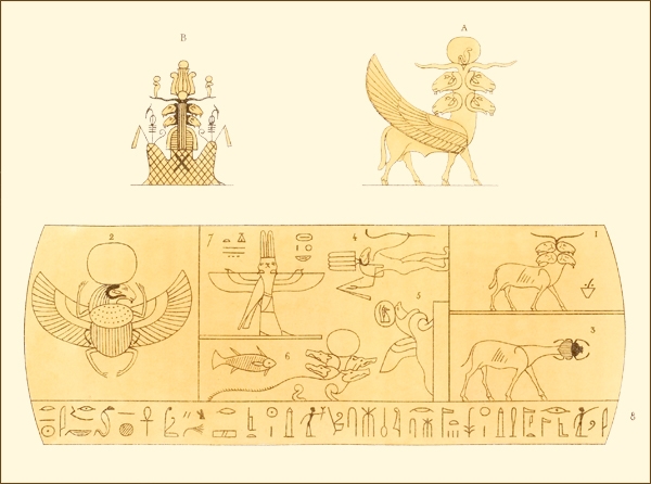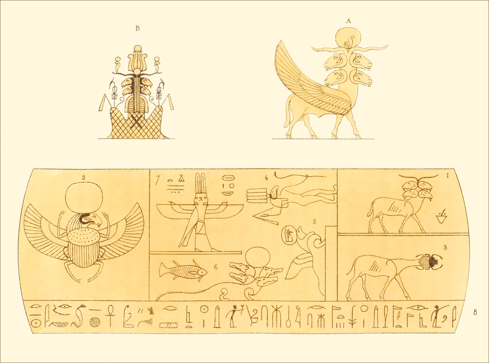 On reconnaît encore cette image sur un genre particulier de monuments funéraires que nous avons nommés hypocéphales, parce qu’ils sont souvent placés sous la tête des momies humaines. Ce sont des disques, soit en bronze, soit en cartonnage de toile[12], gravés ou peints, et couverts de tableaux symboliques accompagnés de légendes. Amon à quatre têtes de bélier assis, et tenant les deux sceptres déja indiqués, en occupe toujours le centre. Les scènes emblématiques dont ces hypocéphales sont couverts, sont toutes relatives à la cosmographie religieuse; par leur forme, ces 8 monuments rappellent celle du monde matériel; et la place du grand-être cosmogonique duquel tout a procédé était naturellement marquée au centre même de cette composition symbolique.