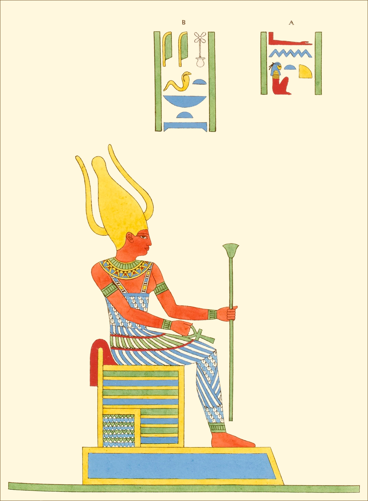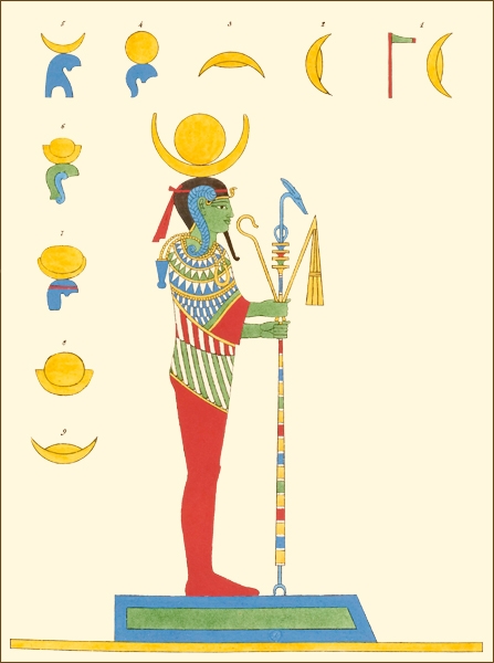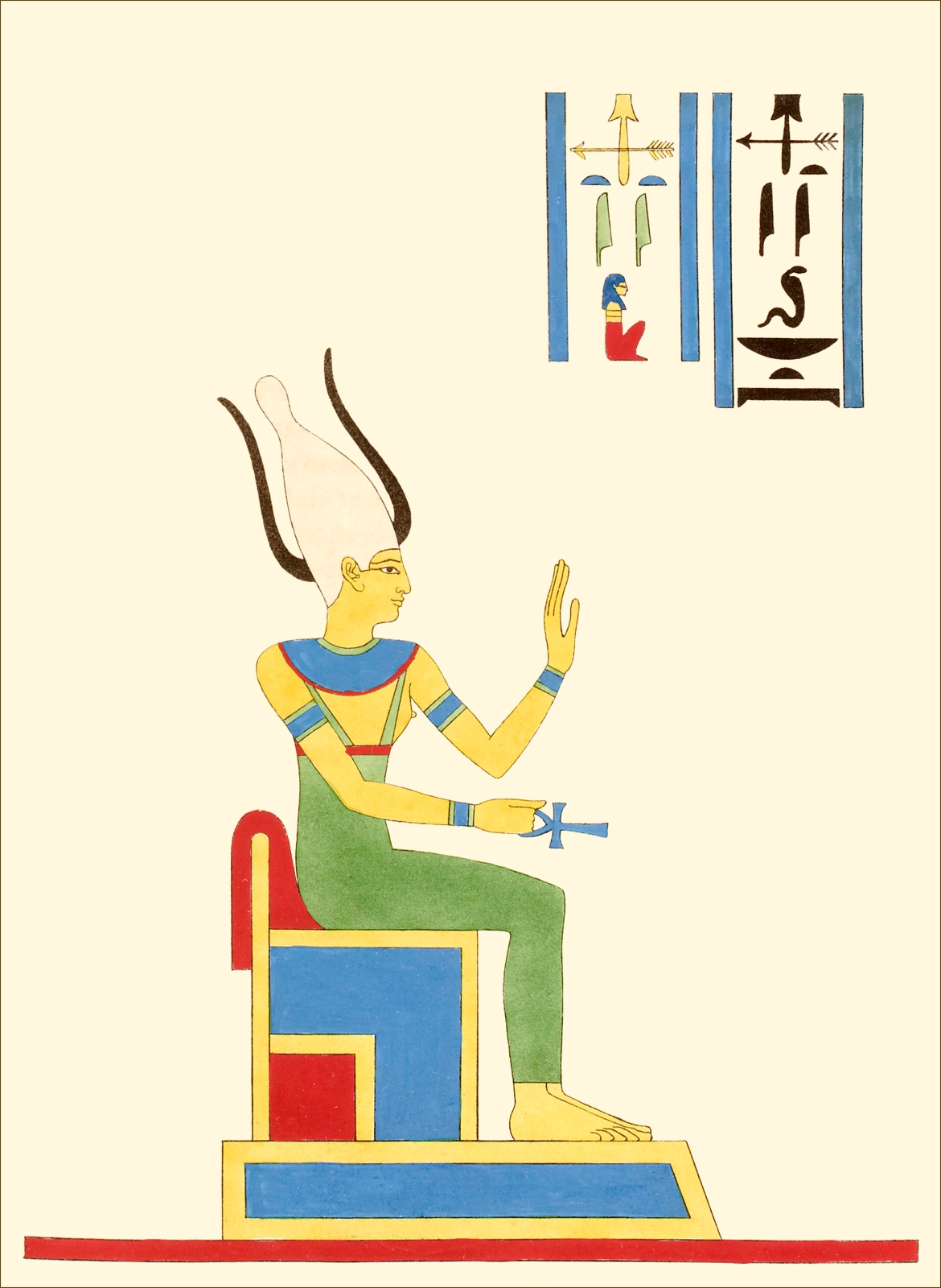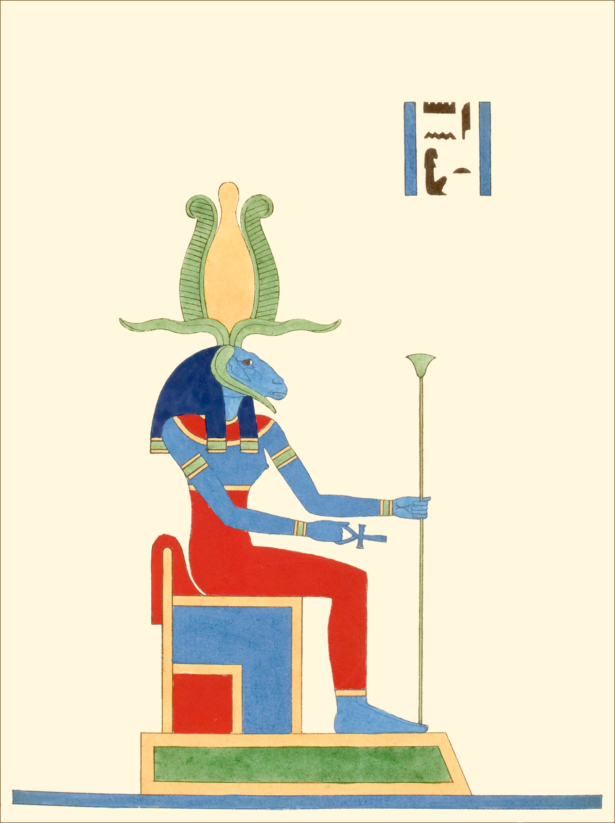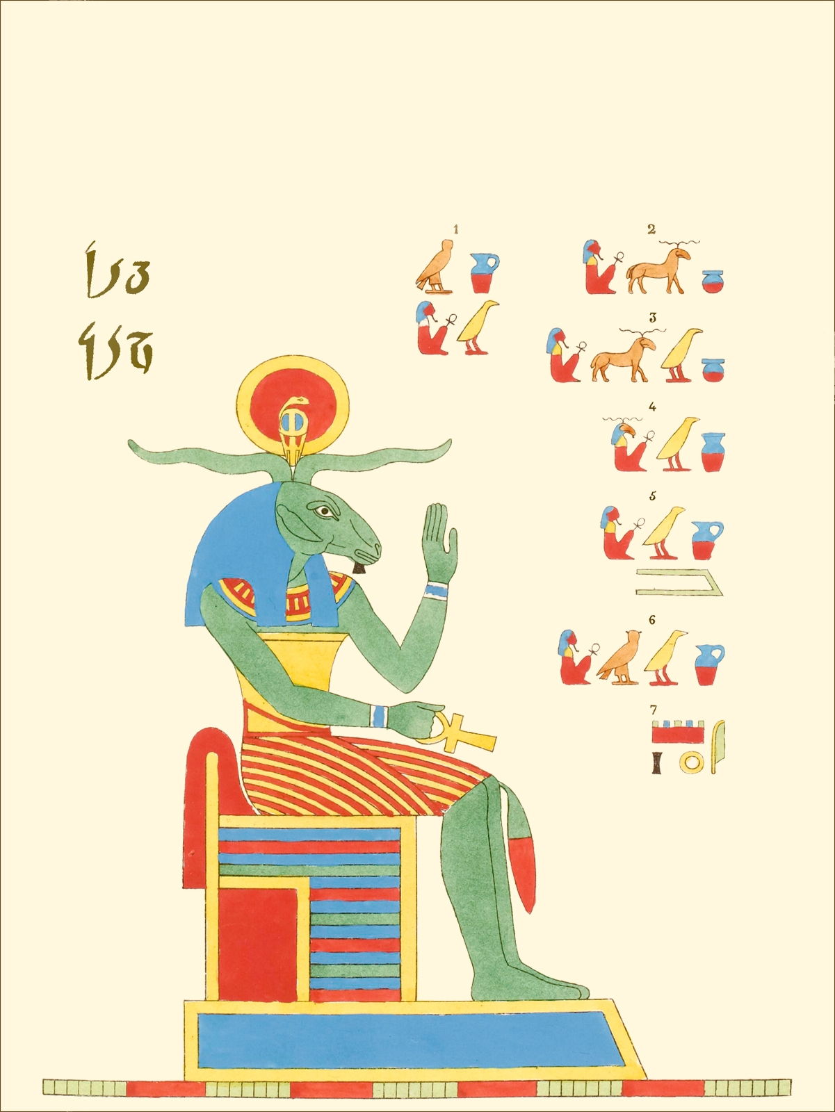 Le dieu est assis sur son trône; sa tête est celle d’un bélier, et toutes ses chairs sont bleues et souvent vertes, comme celles d’Amon, dont il n’est lui-même qu’une simple modification; un grand disque, porté sur des cornes de bouc, symboles de la force génératrice, surmonte sa tête, au-dessus de laquelle se dresse aussi un grand serpent Ureus, emblême de la suprême puissance de vie et de mort que cette divinité exerce sur tous les êtres; sa main droite tient le signe ordinaire de la vie divine, et la gauche, plus souvent armée du sceptre des dieux bienfaisants, est ici élevée en signe de protection.