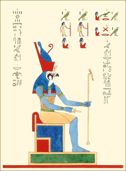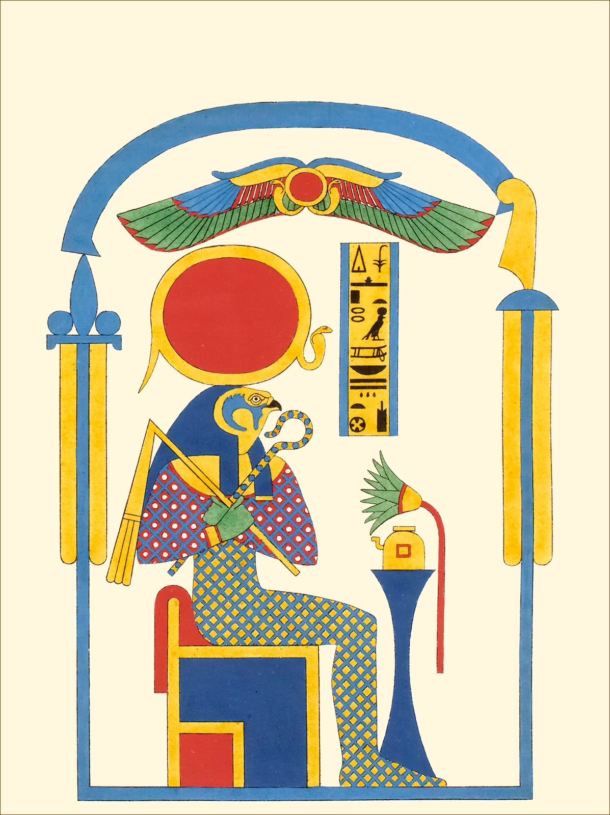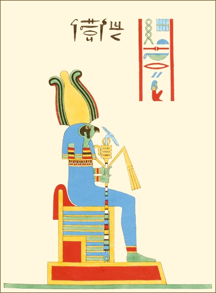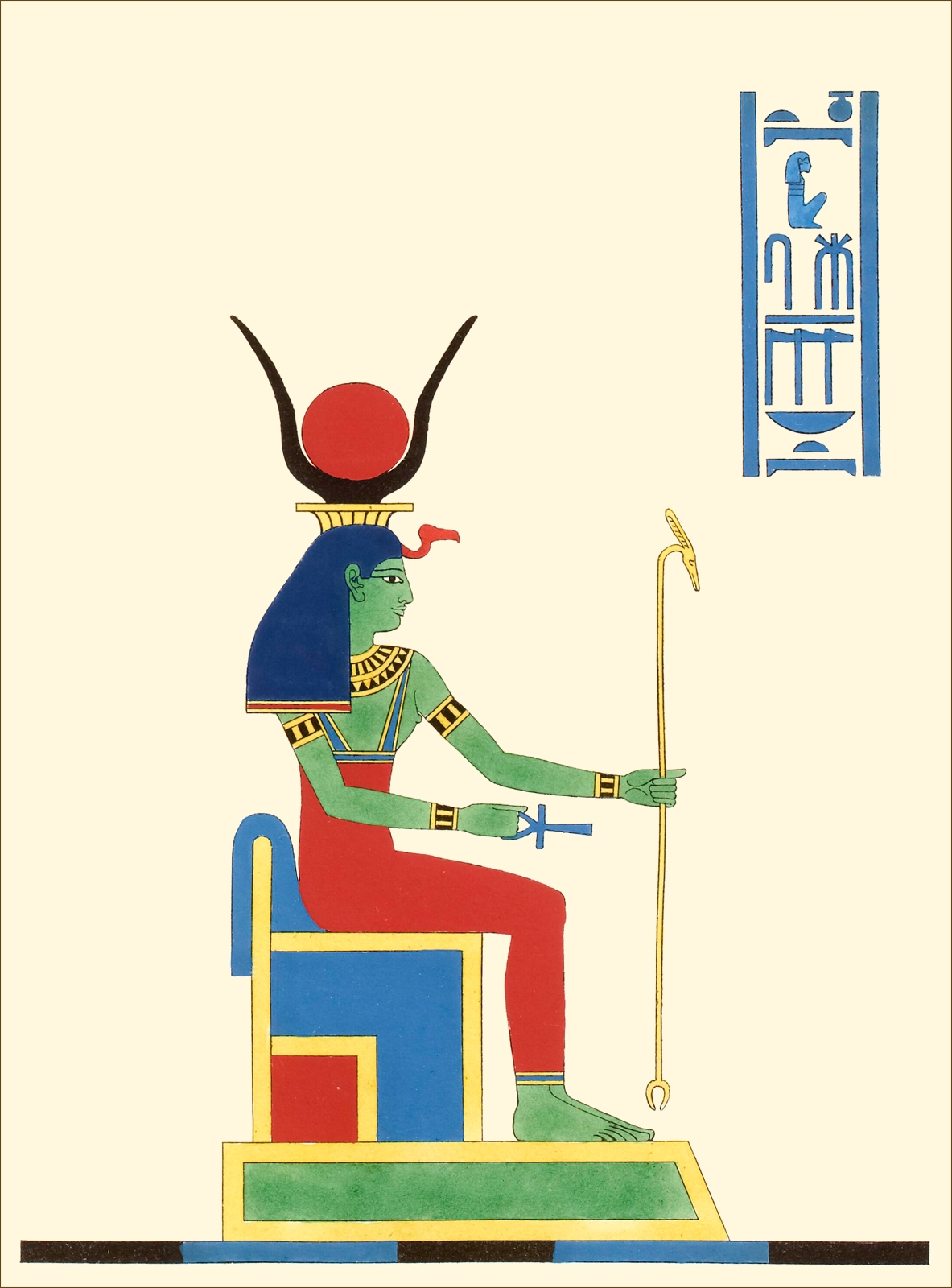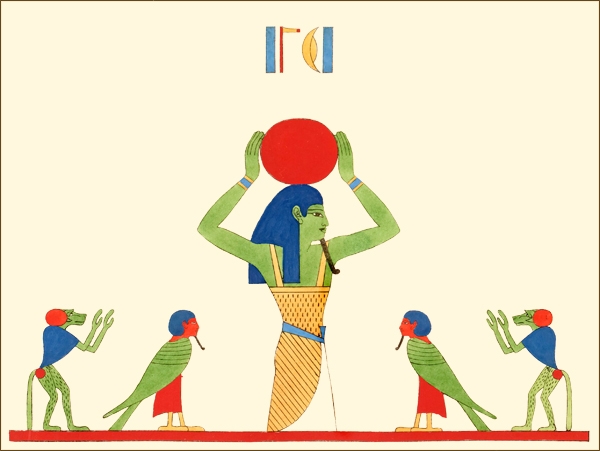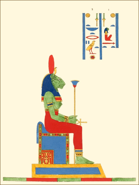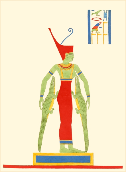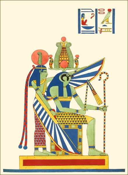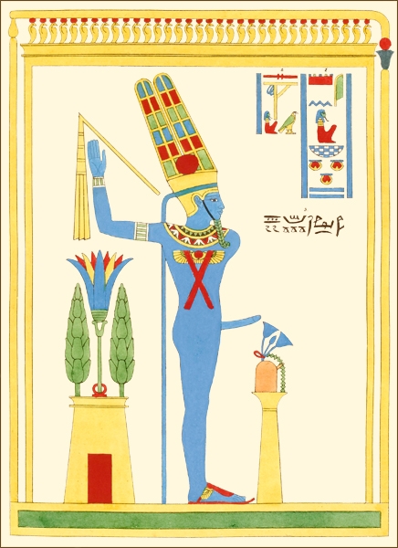 Le dieu est assis sur son trône; sa tête est celle d’un bélier, et toutes ses chairs sont bleues et souvent vertes, comme celles d’Amon, dont il n’est lui-même qu’une simple modification; un grand disque, porté sur des cornes de bouc, symboles de la force génératrice, surmonte sa tête, au-dessus de laquelle se dresse aussi un grand serpent Ureus, emblême de la suprême puissance de vie et de mort que cette divinité exerce sur tous les êtres; sa main droite tient le signe ordinaire de la vie divine, et la gauche, plus souvent armée du sceptre des dieux bienfaisants, est ici élevée en signe de protection.
