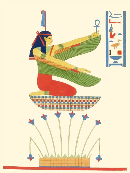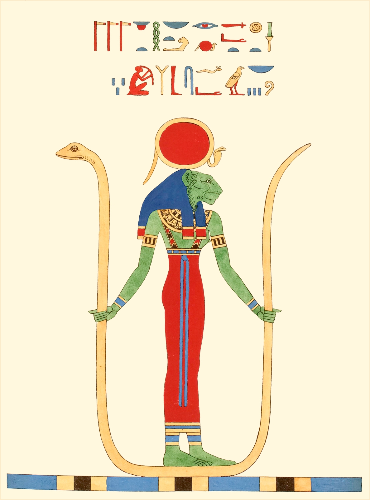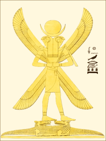 Cette grande divinité, une des modifications d’Amon, fut considérée par les Égyptiens, comme la source de tous les biens moraux et physiques; on l’appelait spécialement le bon Génie (Αγαθοδαιμων), le bon Esprit; c’était le principe de toutes choses, l’esprit qui animait et perpétuait le monde en le pénétrant dans toutes ses parties[29].