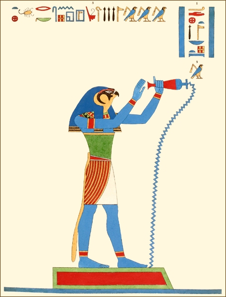 La légende hiéroglyphique qui accompagne ordinairement les représentations de cet être divin, est celle que porte notre gravure, et qui signifie, dans son entier, Amon-ré, seigneur des trois régions du monde, seigneur suprême ou céleste.