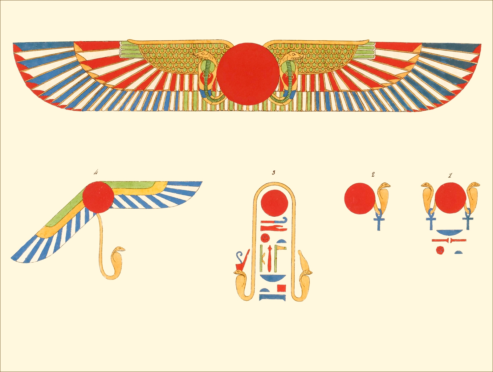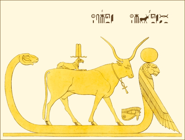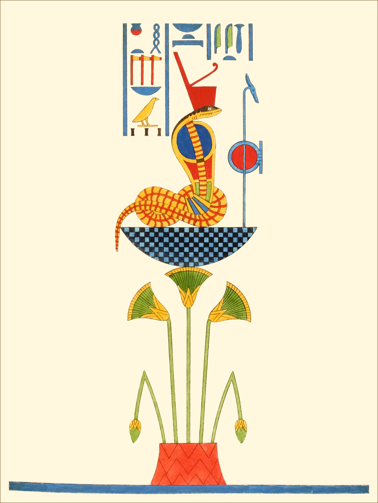 Les archéologues ont cru jusqu’ici que le serpent, emblême du Bon Génie Cnouphis, était ce reptile remarquable par la dilatation de son corps, qui décore la coiffure des Dieux et des Rois, et se montre si fréquemment dans les sculptures égyptiennes, soit groupé avec d’autres symboles, soit isolé et ayant la tête ornée de diverses coiffures; mais cet aspic, qui n’a rien de commun avec le serpent du Bon Génie, porta chez les Égyptiens le nom d’Οὐραῖος (Ouraios)[32], mot qui, dépouillé de la finale que les Grecs y ont ajoutée en le transcrivant, contient, sans aucun doute, le mot égyptien OURO, Roi; c’est pour cela que cet aspic fut en même temps l’emblême et l’insigne de la Puissance royale; aussi 16 les Grecs traduisirent-ils son nom par Βασιλίσκος, mot dérivé de Βασιλεὺς, Roi, comme le nom égyptien lui-même.