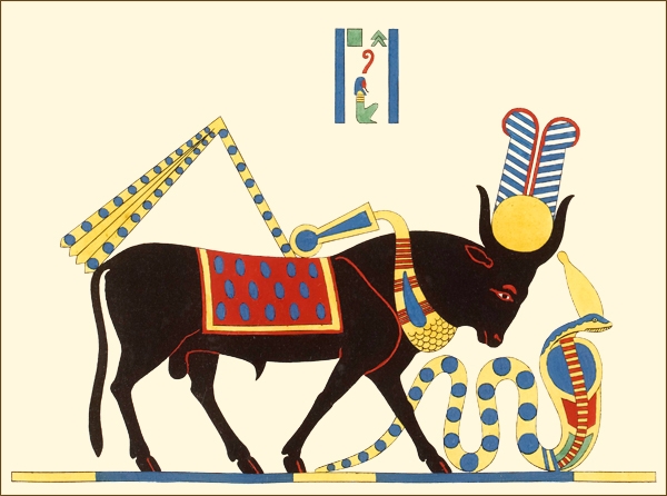Le bélier, d’après les idées des Égyptiens, était un animal remarquable, surtout par sa tête dans laquelle réside sa principale force; et comme il est aussi le chef et le conducteur du troupeau, il devint pour eux le symbole de la prééminence, de la principauté, dont ses cornes furent aussi l’emblême chez plusieurs nations orientales; c’est pour cela que les Égyptiens, selon Plutarque, le placèrent à la tête des animaux du zodiaque, et que ce quadrupède fut spécialement consacré au chef 4 des dieux, au Seigneur suprême, à Amon, dont les représentations empruntent la tête de cet animal, de la même manière qu’on verra tous les dieux Égyptiens figurés sous une forme humaine, mais avec la tête des divers animaux, quadrupèdes, oiseaux, amphibies, reptiles ou insectes, qui leur furent spécialement consacrés.