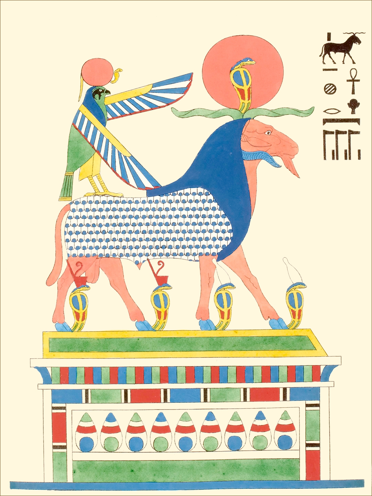 Notre planche 2.4[21] représente le bélier sacré à une seule tête décorée du disque et de l’uræus. L’épervier, symbole du soleil, voltige 11 au-dessus du bélier, aux pattes antérieures duquel sont liés des serpents uræus portant la coiffure emblématique des régions d’en haut; d’autres uræus, la tête couverte de la coiffure emblématique des régions d’en bas, paraissent attachées aux pattes postérieures de l’animal sacré, marchant sur la forme d’une coudée (mesure égyptienne de longueur), peinte en vert. Le tout repose sur un autel enrichi d’ornements peints de diverses couleurs.