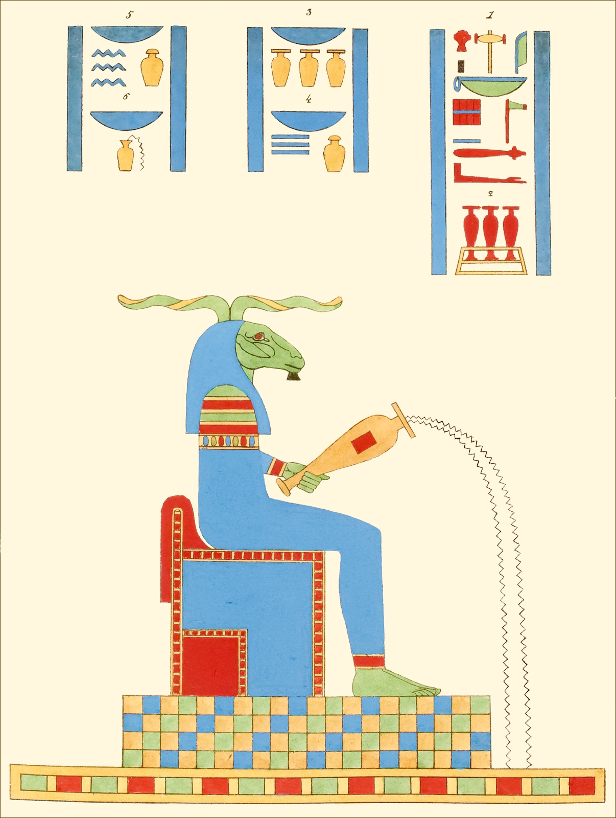 Le grand Démiurge égyptien Cnouphis, considéré comme le Nil céleste et comme la source et le régulateur du Nil terrestre, est très-souvent figuré dans les bas-reliefs des temples, sur les cercueils et les diverses enveloppes des momies. Ses images ne diffèrent point très-essentiellement de celle que nous donnons ici sous le no 3.3. Partout il se montre avec sa tête de Bélier et ses chairs de couleur verte, quelquefois aussi de couleur bleue. On le distingue uniquement à sa légende et à quelques attributs particuliers.