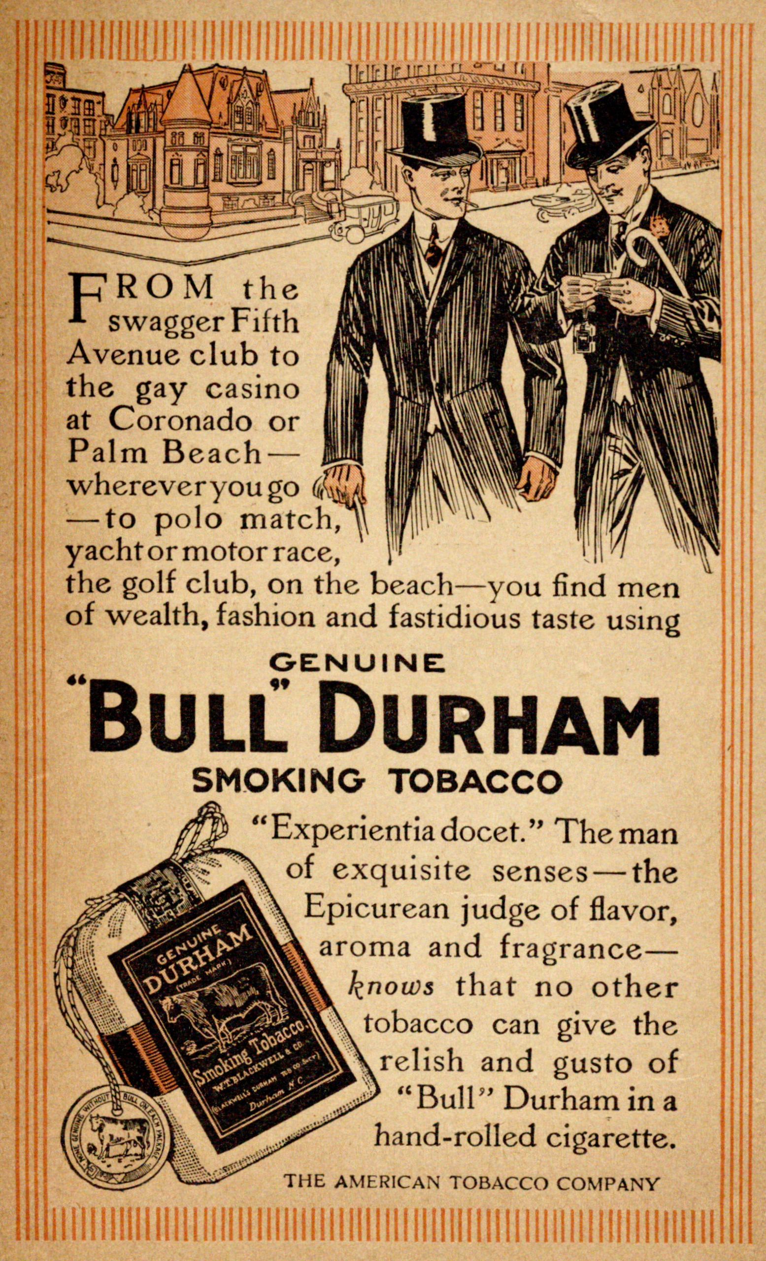 “Experientia docet.” The man of exquisite senses—the Epicurean judge of flavor, aroma and fragrance—knows that no other tobacco can give the relish and gusto of “Bull” Durham in a hand-rolled cigarette.
