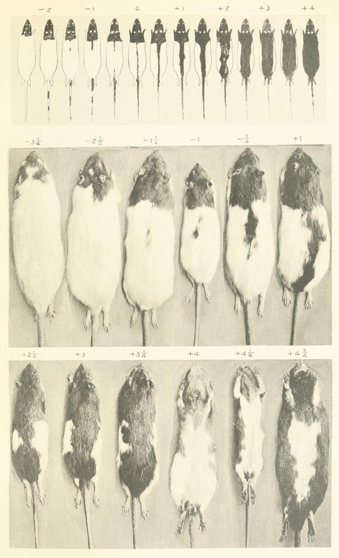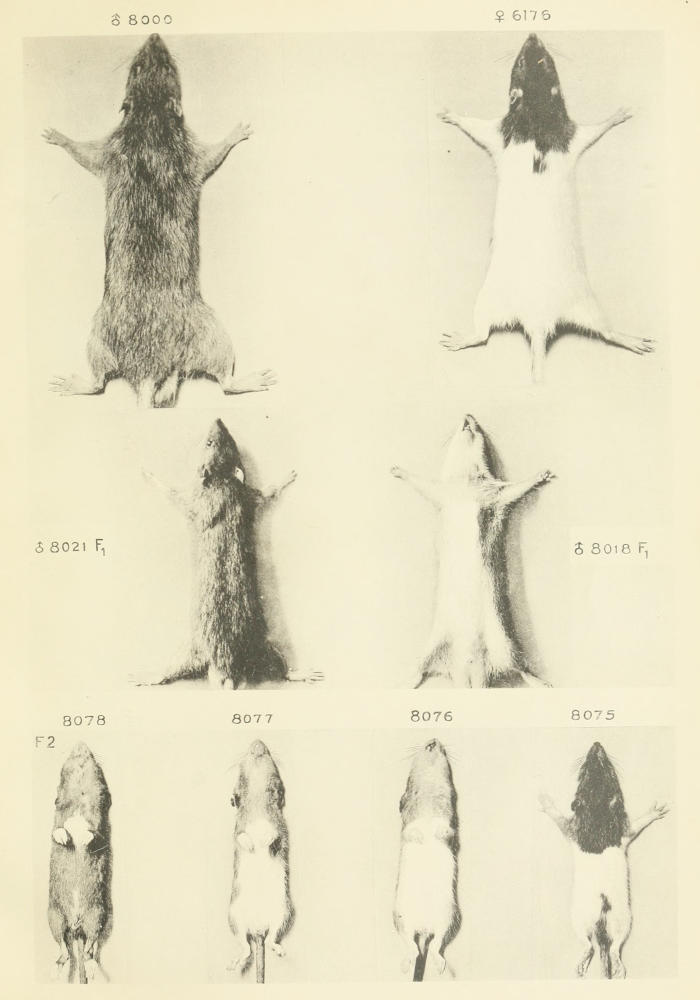 In June 1906 Dr. Hansford MacCurdy completed, under the direction of the senior author, a study of the inheritance of color in rats. His studies had shown that the piebald pattern of “hooded” rats behaves as a mendelian recessive character in relation to the uniform or nearly uniform coloration of wild rats, but that the hooded pattern, when extracted from a cross with wild stock, shows a different variability, the pigmentation of the extracted recessives being increased in extent. This result was interpreted as showing the unsoundness of the current doctrine of “purity of the gametes” in mendelian crosses.