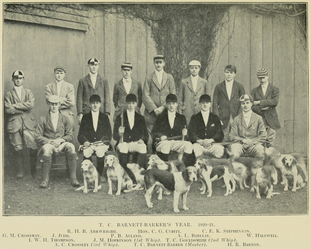 [6] Notable exceptions were G. W. Barclay (killed in the War), son of Mr. E. E. Barclay, M.F.H. the Puckeridge, and K. S. M. Gladstone, who had had a pack of his own in Essex before he went to Eton. These two Masters of the E.C.H. undoubtedly did a very great deal to bring the pack to a high standard.