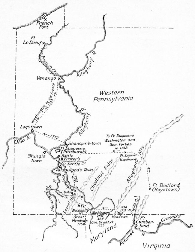 1754. In January Major George Washington is back to report to Governor Dinwiddie at Williamsburg that the French refuse to withdraw from their line of posts. An expedition is organized to build a British post at the Forks of the Ohio. Major Washington is commissioned lieutenant-colonel, as second in command. In April he marches with three companies to support a detachment already gone. The detachment is driven from the Forks by the French, and as commander in the field, Lieutenant-Colonel Washington entrenches at Great Meadows, short of the Forks. On May 28th he surprises a French and Indian detachment and defeats it. This is his first battle; he is twenty-two years old. Having been reinforced to 400 men, at Great Meadows he erects a log fort named Fort Necessity, in order to hold fast, and on July 3rd is attacked by 900 French and Indians. This night terms are made by which the garrison should march out with the honors of war. On July 4th Fort Necessity is abandoned to the French. The French build Fort Duquesne at the Forks of the Ohio.