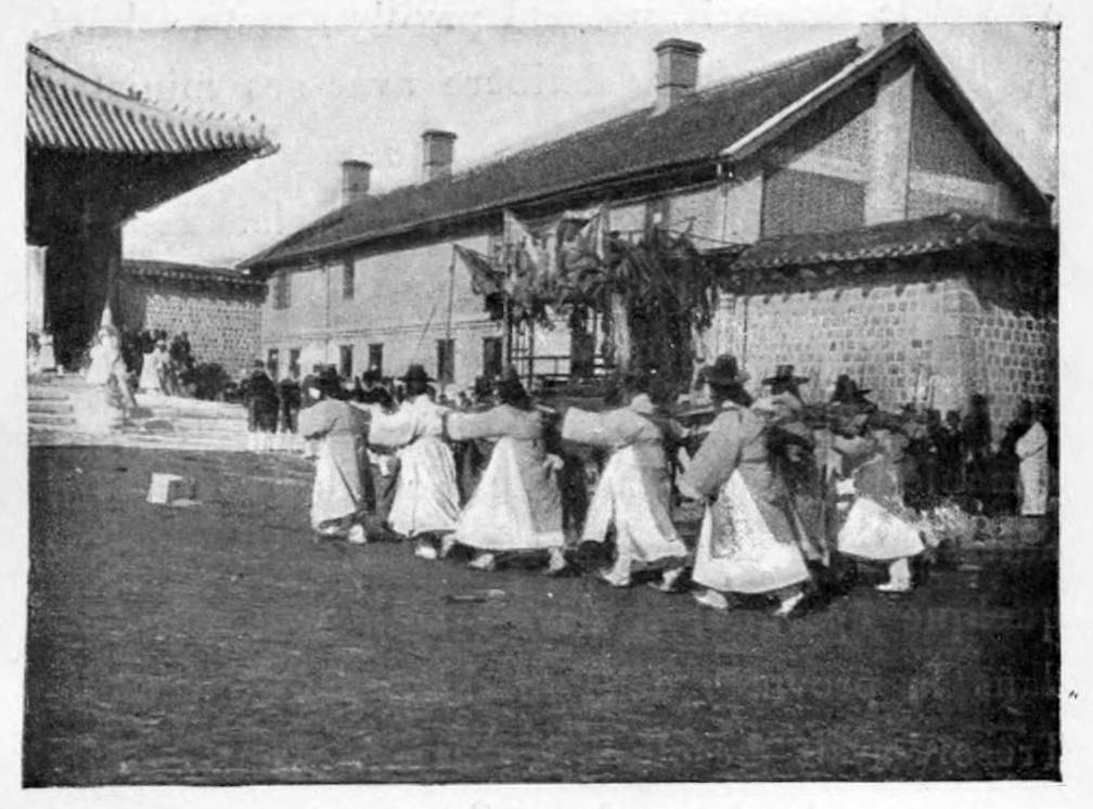 Les filles jouent au volant, et, n’ayant pas de raquette, elles le lancent et le rattrapent avec le pied, très gracieusement. Devant les marchands de jujube, de noisettes et de châtaignes on s’attroupe, on fait la dînette, on coupe les miettes en quatre et la bande joyeuse reprend son essor et réjouit le quartier. « Réfléchissez pendant que vous êtes têtard », dit le proverbe, mais les enfants de Séoul se moquent des proverbes et font les diables.