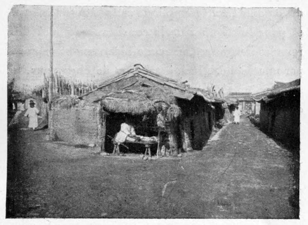 Les toitures ordinaires sont en paille, elles penchent de travers, plus lentement inclinées du côté du soleil, plus brusques sous le vent du nord. Elles sont retenues par des ficelles et des pierres et forment des auvents sous lesquels le Coréen aime à prendre l’air. Les ambitieux rêvent à une toiture en faïence bleue, à la chinoise, mais c’est un luxe de grand seigneur et la plupart des Coréens se contentent du paillasson.