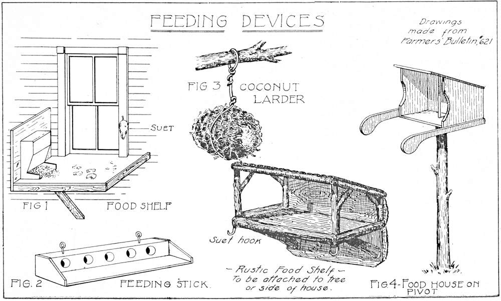 Many types of feeders can be made, varying the plain wood shelf, to the artistic food shelters of natural limbs and bark. Some feeders can be placed on movable pivots on poles with extended vanes in front so that the wind will always cause them to be in a sheltered position. This type of feeding shelf, Fig. 4, and others are shown on Plate 20.