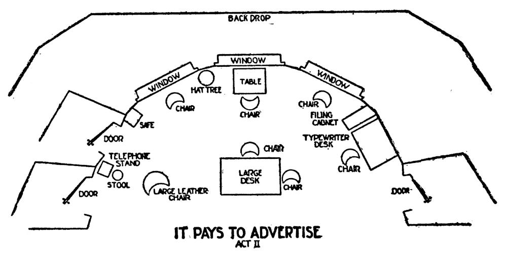 CAUTION: Professionals and amateurs are hereby warned that “IT PAYS TO ADVERTISE,” being fully protected under the copyright laws of the United States, is subject to a royalty, and any one presenting the play without the consent of the owner or his authorized agents will be liable to the penalties by law provided. Application for amateur acting rights must be made to Samuel French, 28-30 West 38th Street, New York. Applications for the professional acting rights must be made to the American Play Company, 33 West 42d Street, New York.