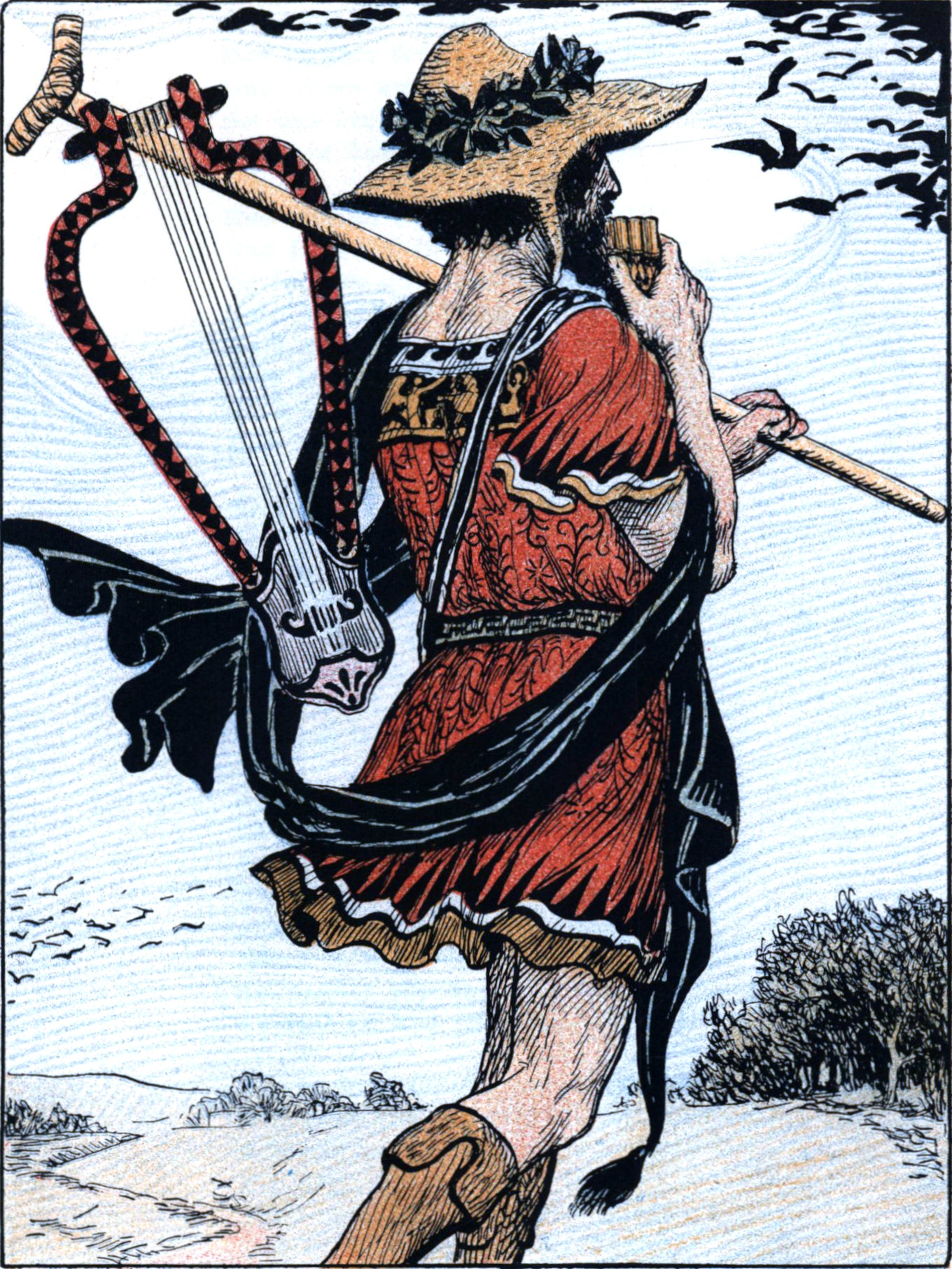 Odysseus nahm von den im Schiffe mit ihm angekommenen Gefährten nur zwölf der tapfersten mit sich; den übrigen befahl er, bei dem Schiffe zu bleiben. Mit jenen ging er nach der Höhle. Weil sie aber nicht wußten, ob sie daselbst etwas zu essen fänden, nahmen sie Speise mit, auch einen ziegenledernen Schlauch voll Weines, den Odysseus zu Ismaros von einem Priester erhalten hatte und der so süß und feurig war, daß man beim Trinken einen Becher desselben mit zwanzig Bechern Wasser vermischen mußte.