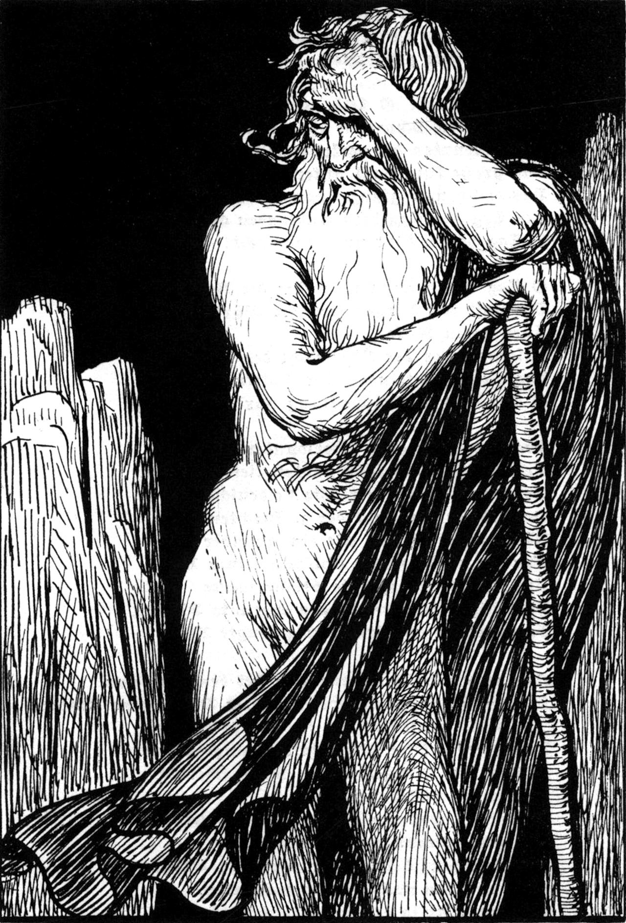 Die Ausgewählten gingen mit Odysseus zum Schiffe und ergriffen die Ruder. Als sie das Gestade erreichten, erblickten sie eine hochgewölbte Felsenhöhle, die von zahllosen Lorbeerbäumen umschattet war. Ein hohes Gehege, von Felsstücken und Baumstämmen erbaut, umgab dieselbe. In ihr wohnte ein Mann, der am Tage seine Herden auf entlegene Weiden trieb und mit niemand Umgang pflegte. Gräßlich war er gestaltet und glich nicht anderen Menschen; riesenhaft ragte er empor wie ein vereinzelter waldreicher Gipfel eines Gebirges, und fürchterlich war sein Ansehen namentlich dadurch, daß er nur ein Auge hatte, das, groß und gräßlich blickend, mitten auf der Stirn stand.