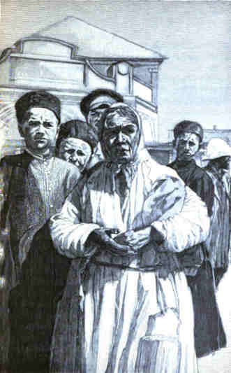 Partout l'animation est grande. Dans la foule, peu ou point de chapeaux, rien que des casquettes. Voici des marchands, tout de noir vêtus, avec une grande et ample lévite, des moujiks avec la traditionnelle chemise rouge, des Tatars coiffés de bonnets en peau de mouton, des marchands de poissons secs, d'autres chargés de chapelets de biscuits, des mendiants déguenillés, des nonnes, et au milieu de cette cohue un va-et-vient incessant de drochki et de véhicules[Pg 9] bizarres. En Russie, quiconque a quelques sous en poche va en voiture.