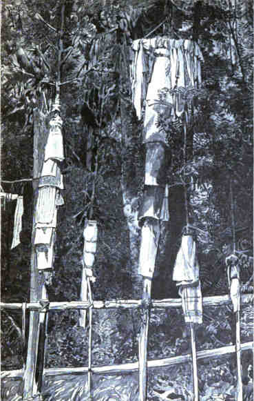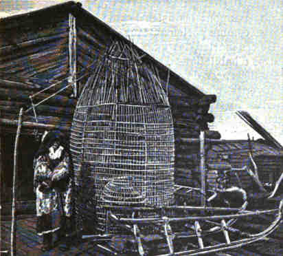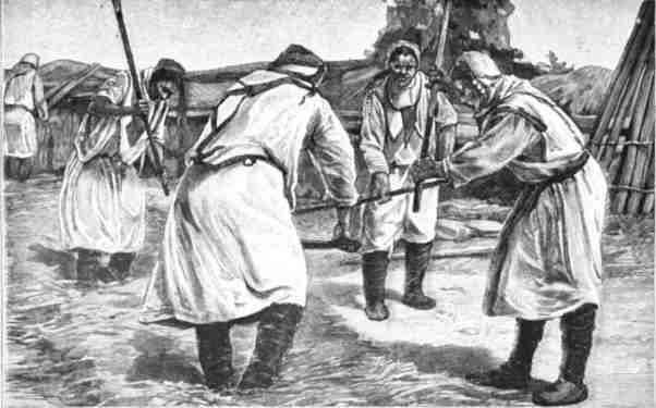 [20] Dans le gouvernement de Vologda, des excavations portent le nom caractéristique de poghibelnitsy (mot à mot: endroit où l'on meurt). Au-dessus de ces trous les Tchoudes élevaient, au moyen de troncs d'arbres, des terre-pleins et du haut de ces forteresses se défendaient énergiquement. La lutte devenait-elle inégale, ils coupaient les pieux qui soutenaient l'édifice et s'ensevelissaient sous les décombres, préférant la mort à l'esclavage, absolument comme des héros de l'antiquité. Annuaire du gouvernement de Vologda. Lieux dits. Livre très intéressant.
