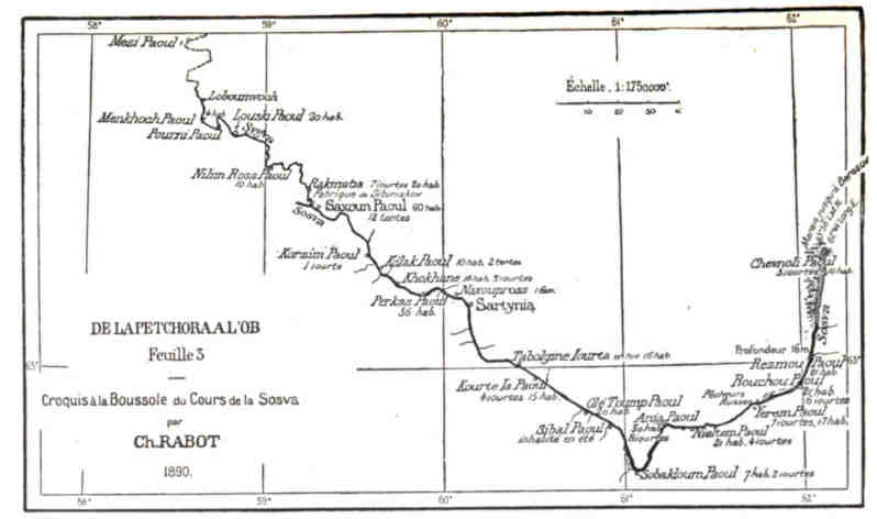 La première part d'Arkhangelsk, passe par Pinéga, Mézène, et débouche dans la Petchora à Oust-Zylma. D'Arkhangelsk à Oust-Zylma, le pays et les indigènes sont peu intéressants, et à partir de cette dernière ville on doit remonter la Petchora à contre-courant pour atteindre l'Oural: d'où fatigues et perte de temps.