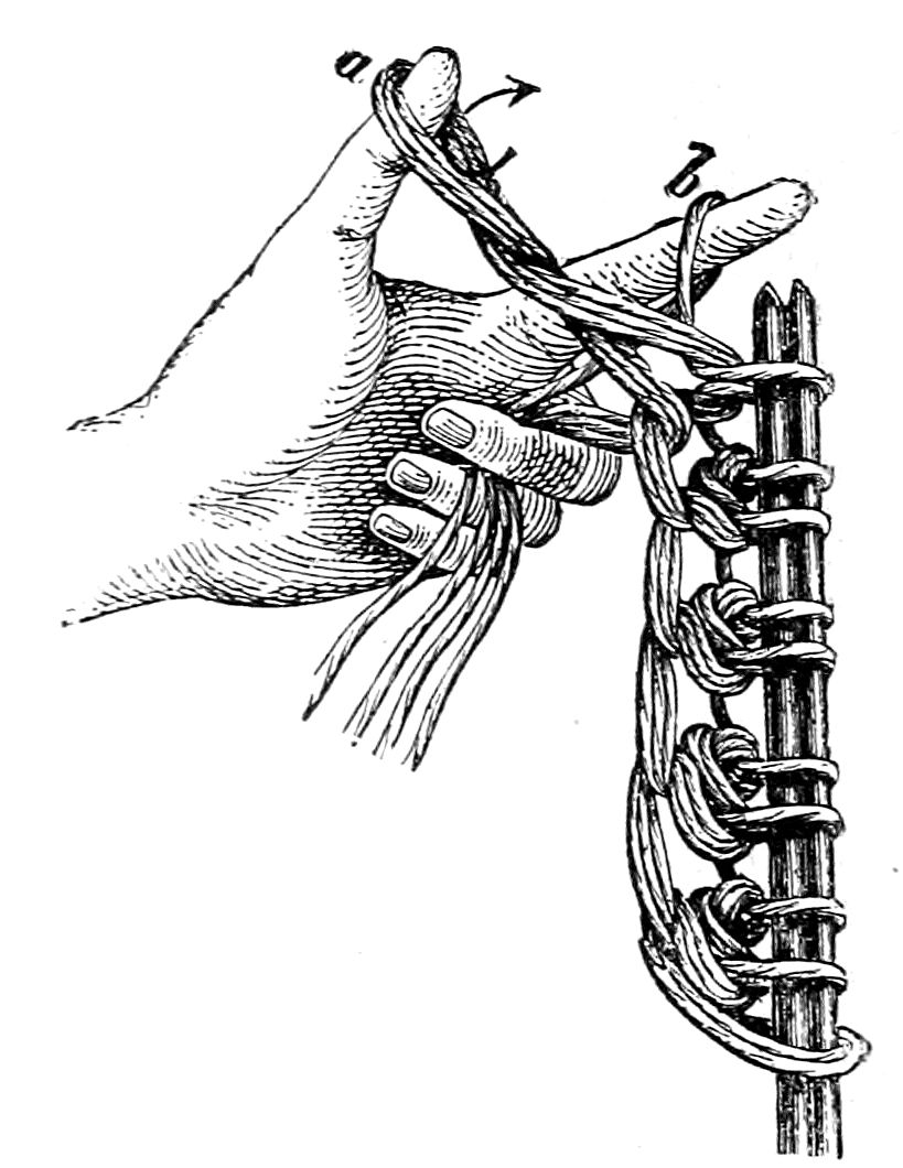 To Pearl, Purl or Seam, (meaning the same thing), is done by holding with the left hand a needle on which a row of stitches has been cast. Take a needle in the right hand, place the cotton over the left hand needle and the first finger of the left hand, hold the end with the second finger of the same hand. Insert the right hand needle through the loop on the left hand needle, point right to left, in such a manner as to have the cotton just under the right hand needle. Pull this cotton through the loop, withdraw the left hand needle from the loop, and the purled stitch is formed.