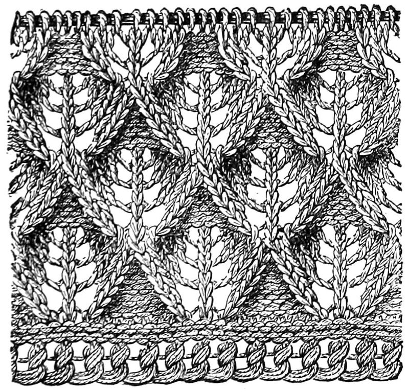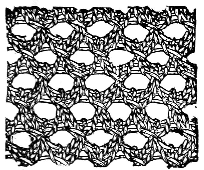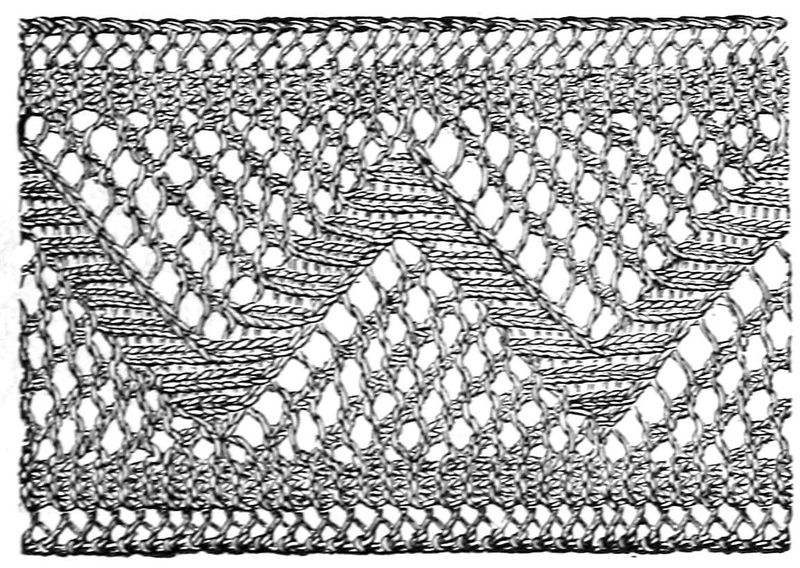 Repeat from * to end of row; but in every following row knit together plain the slipped stitch and “the make 1” of preceding row, and slip the stitch which was knitted after “the make 1” in preceding row. Repeat from 1st to 22d rows until the required length is worked.
