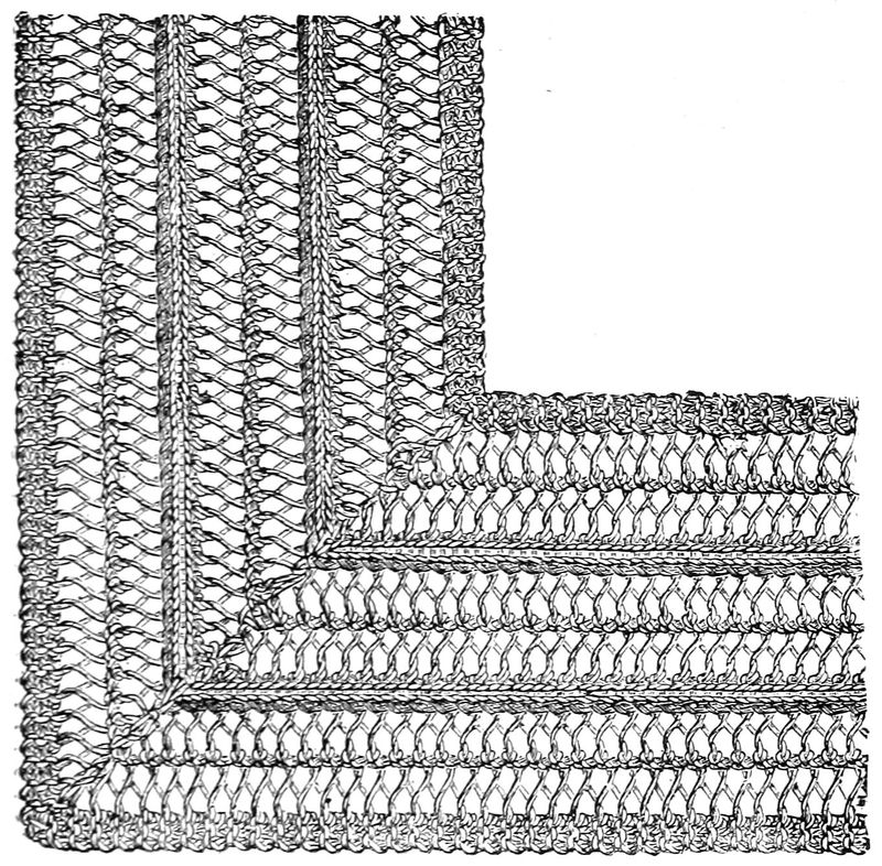 The best results are obtained by using Oriental Wool, Smyrna Cotton and designs manufactured expressly for the purpose and lately introduced into this market by Messrs. H. Taylor & Co., of Philadelphia. Rugs knitted from these materials are as beautiful and serviceable as the real Oriental Carpets, and, if well done, cannot be distinguished from them.