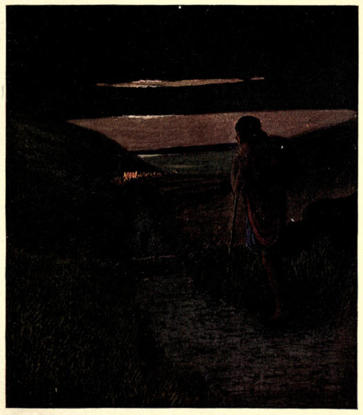 Now whin Keth came to the top of the third ridge an’ looked down upon the great bog, ’twas the darkest hour of the night, whin the bad fairies are up to their worst[37] divilmint, an’ the dangerous elves an’ demons attind to the summons of their masters, the Druid wizards. From the top of the ridge there was no sign of any road across the bog; but Keth, full of foolish faith in the words of the false shanachy, stopped only to draw a full breath, an’ was off down the slope at his top speed.