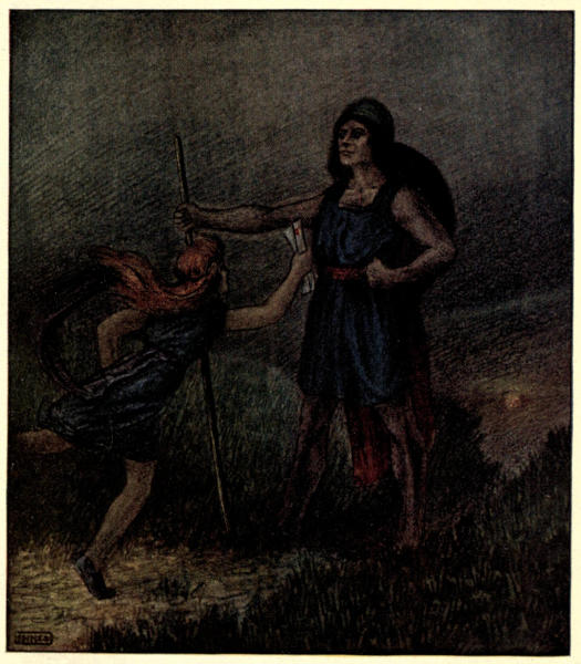 “Keth Mac Maragh,” panted the runner—who was lithe an’ slender, with round cheeks an’ a white chin—“has the day come so soon[65] whin ye forgit the face of your own Finola?”