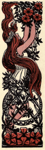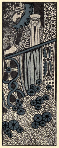 But the thing that most disturbed the mind of Keth Mac Maragh was the sight of Finola of the White Shoulder, wan of Patrick’s three embroideresses—which means a Christian mimber of Patrick’s own household—turnin’ her pretty face to the West with the multitude an’ joinin’ in the cry of “Wurra-Wurra!” ’Twas sure a haythin act, an’ as Keth had been for a long time swate on this[17] same Finola, findin’ her white shoulder a plisant place to rist his head on, he wint speedily an’ taxed her with it.