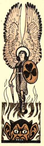 Indade, the triumph was Keth’s, for, by the blissin’ of heaven, he hild out. In fear[41] of the blastin’ rays of the sun, all at wance his demon inemies disappeared with shrieks of baffled vengeance, an’ old Lochru with thim. An’ soon Keth, still praisin’ God an’ defyin’ the divil, was out of the bog an’ dryin’ himsilf in the sun.