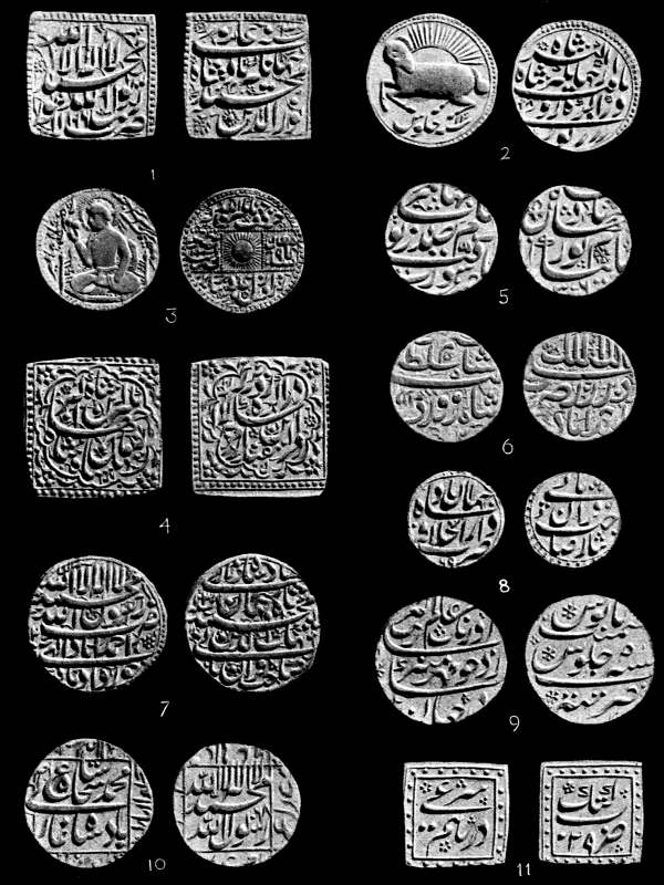 CHAP. VIII.—S. Lane Poole: Catalogue of Coins of the Muhammadan States of India in the British Museum, London, 1885; H. N. Wright: Catalogue of the Coins in the Indian Museum, Calcutta, Vol. II, Oxford, 1907. Bengal.—E. Thomas: “The Initial Coinage of Bengal,” J.A.S.B., 1867, p. 1, 1873, p. 343; A. F. R. Hoernle: “A New Find of Muhammadan Coins of Bengal” (2 papers), J.A.S.B., 1881, p. 53, 1883, p. 211. Kashmir.—C. J. Rodgers: “The Square Coins of the Muhammadan Kings of Kashmir,” J.A.S.B., 1885, p. 92. Bahmanīs.—O. Codrington: “Coins of the Bahmanī Dynasty,” Num. Chron., 1898, p. 259; J. Gibbs: “Gold and Silver Coins of the Bahmanī Dynasty,” Num. Chron., 1881. Gujarat.—G. P. Taylor: “Coins of the Gujarāt Saltanat,” J.B.B.R.A.S., 1904, p. 278. Malwa.—L. White King: “History and Coinage of Mālwā,” Num. Chron., 1903, p. 356, 1904, p. 62. Ma’bar.—E. Hultzch: “Coinage of the Sultans of Madura,” J.R.A.S., 1909, p. 667.