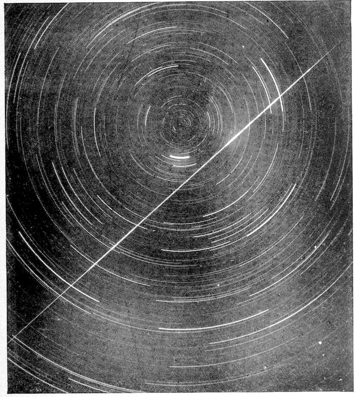 Mr. Denning remarks, in his account of meteors for Splendour of the Heavens, “there are comparatively few astronomers, either professional or amateur, who cultivate the meteoric branch. They evidently do not regard it as an attractive study. In any case, it does not appeal to them sufficiently to enlist their sympathies, and so it has been comparatively neglected in recent years. A few ardent observers have, it is true, continued to devote themselves to the subject,” and he cites instances where two English ladies, Miss A. Grace Cook, director of the Meteoric Section of the B. A. A., in 1922, and the late Mrs. Fiammetta Wilson, endeavored to arouse more enthusiasm in this field of work by both practical example and advice. As an instance of the splendid enthusiasm of the latter, she has to her credit for meteoric observations carried on during an interval of ten years, the 181record of about ten thousand meteors. This is an average of a thousand a year, and anyone who has attempted to keep a steady watch on a starlit night in the hope of observing an evanescent meteor will realize what such a record means. It must have required an immense amount of patience, endurance, and untiring vigilance, for the wily meteor is so apt to take us unawares.