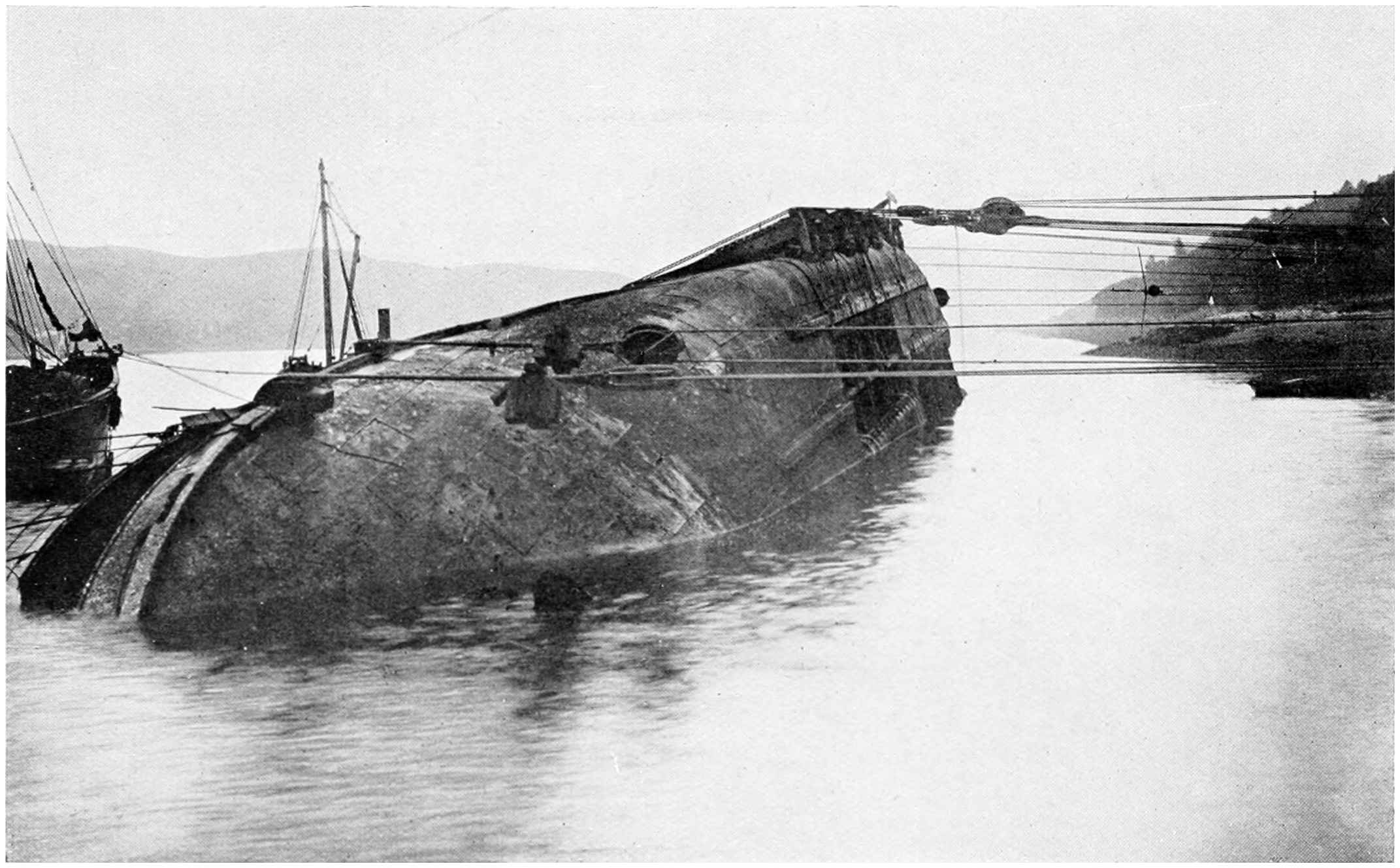 | Towing out the Upside-down Battleship to turn her over | 90 |